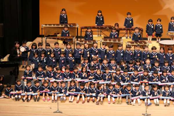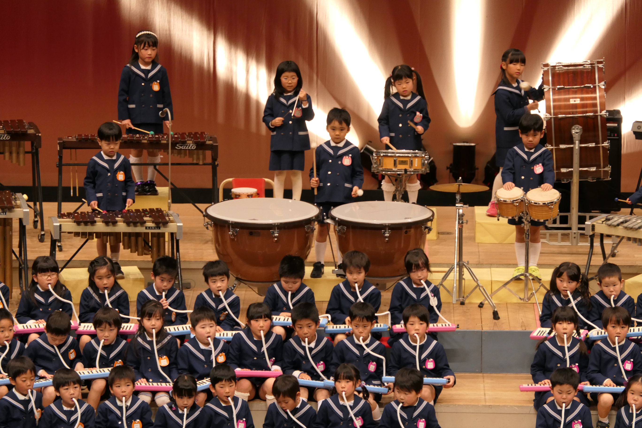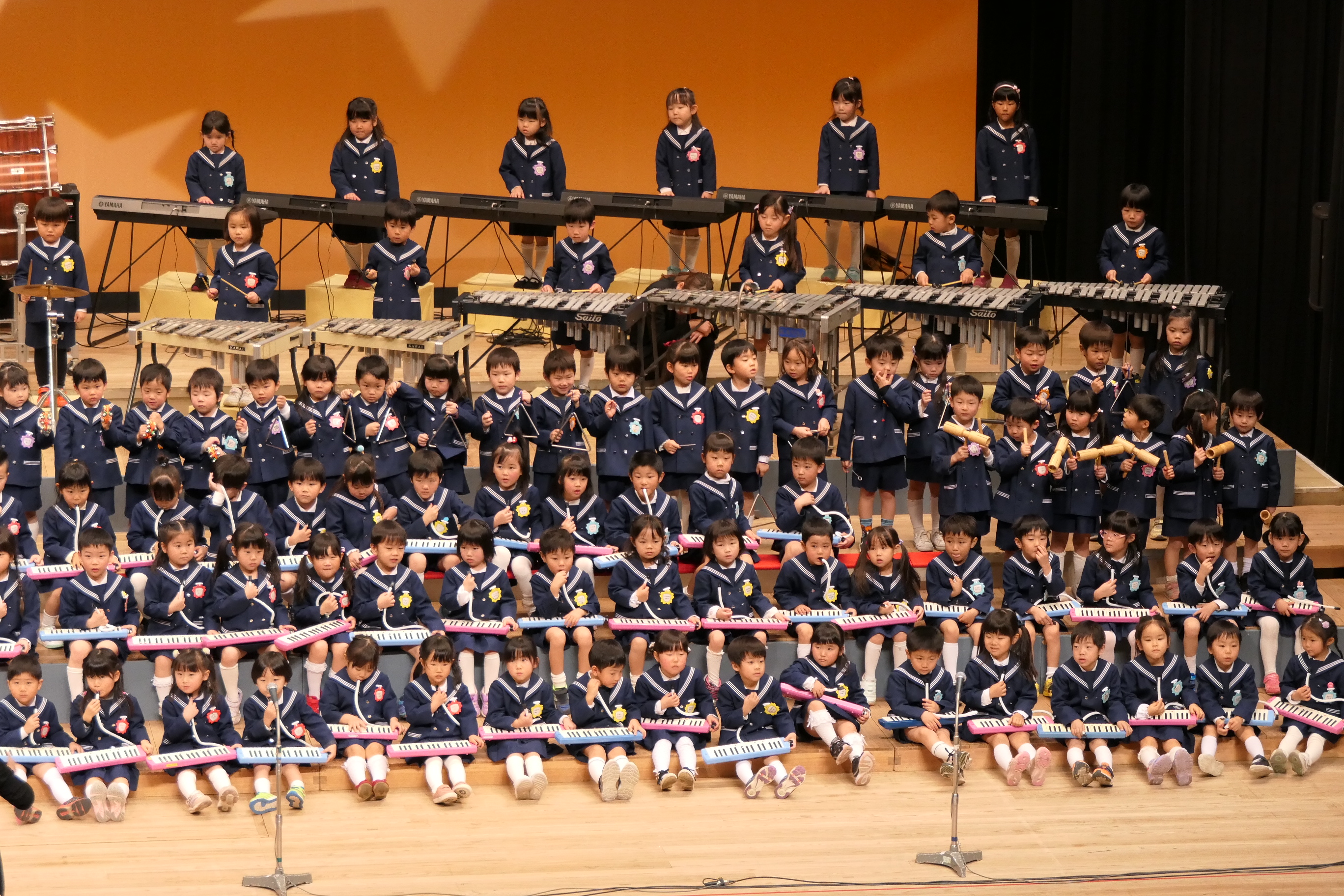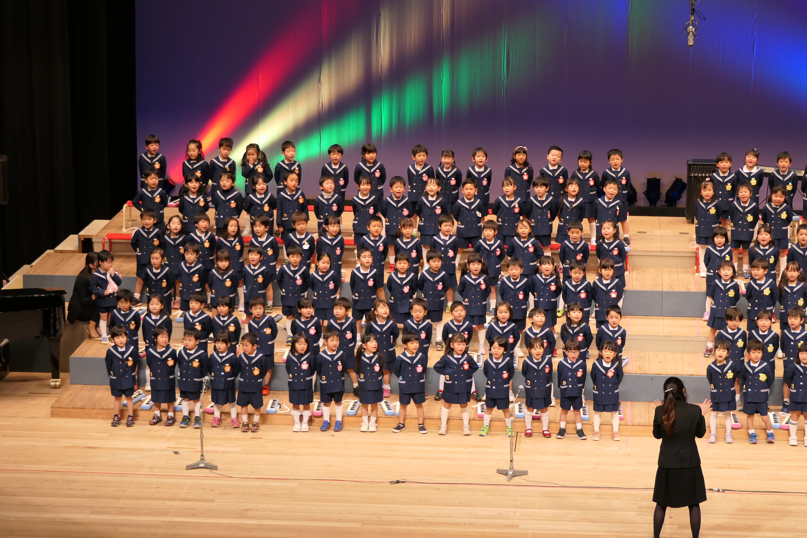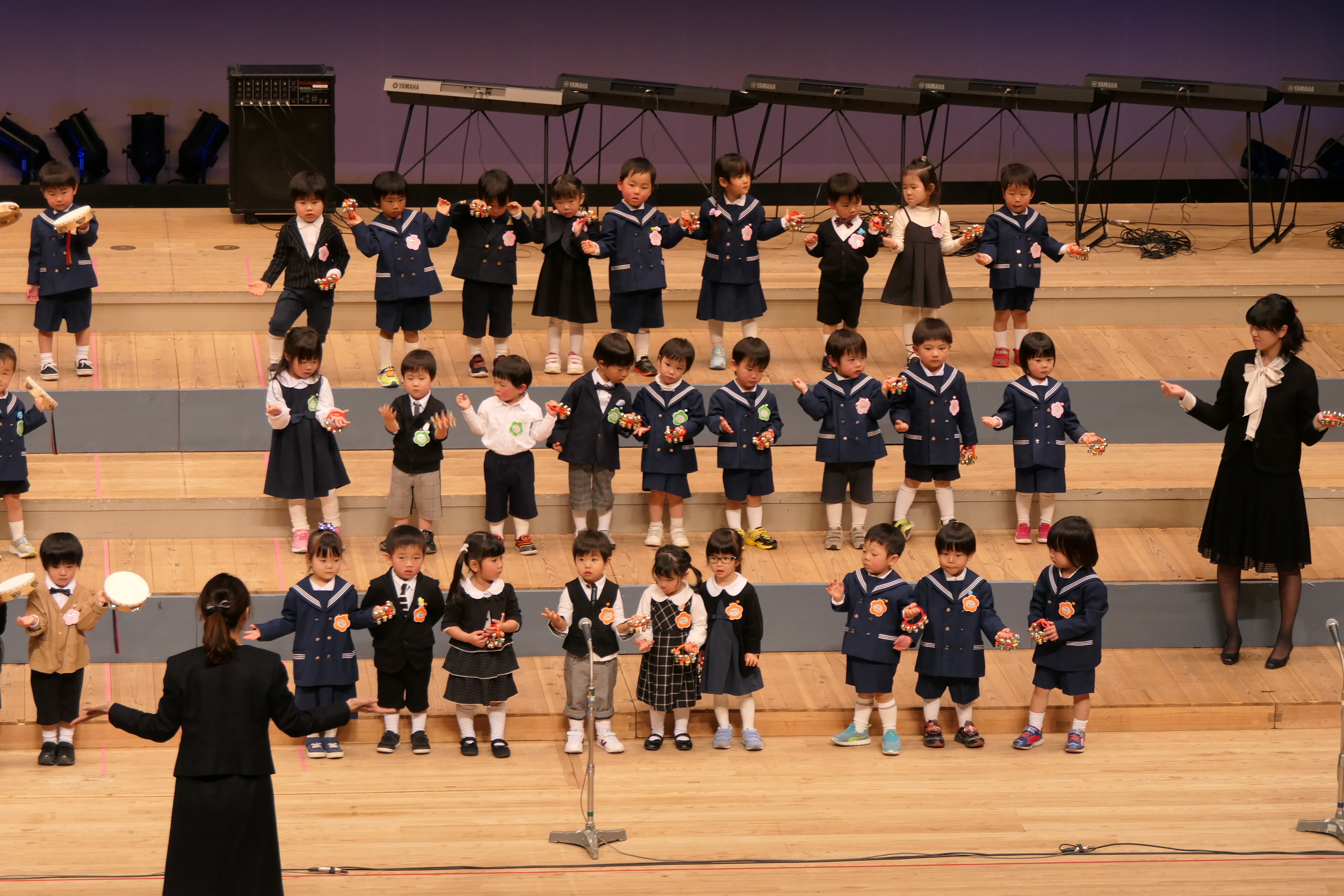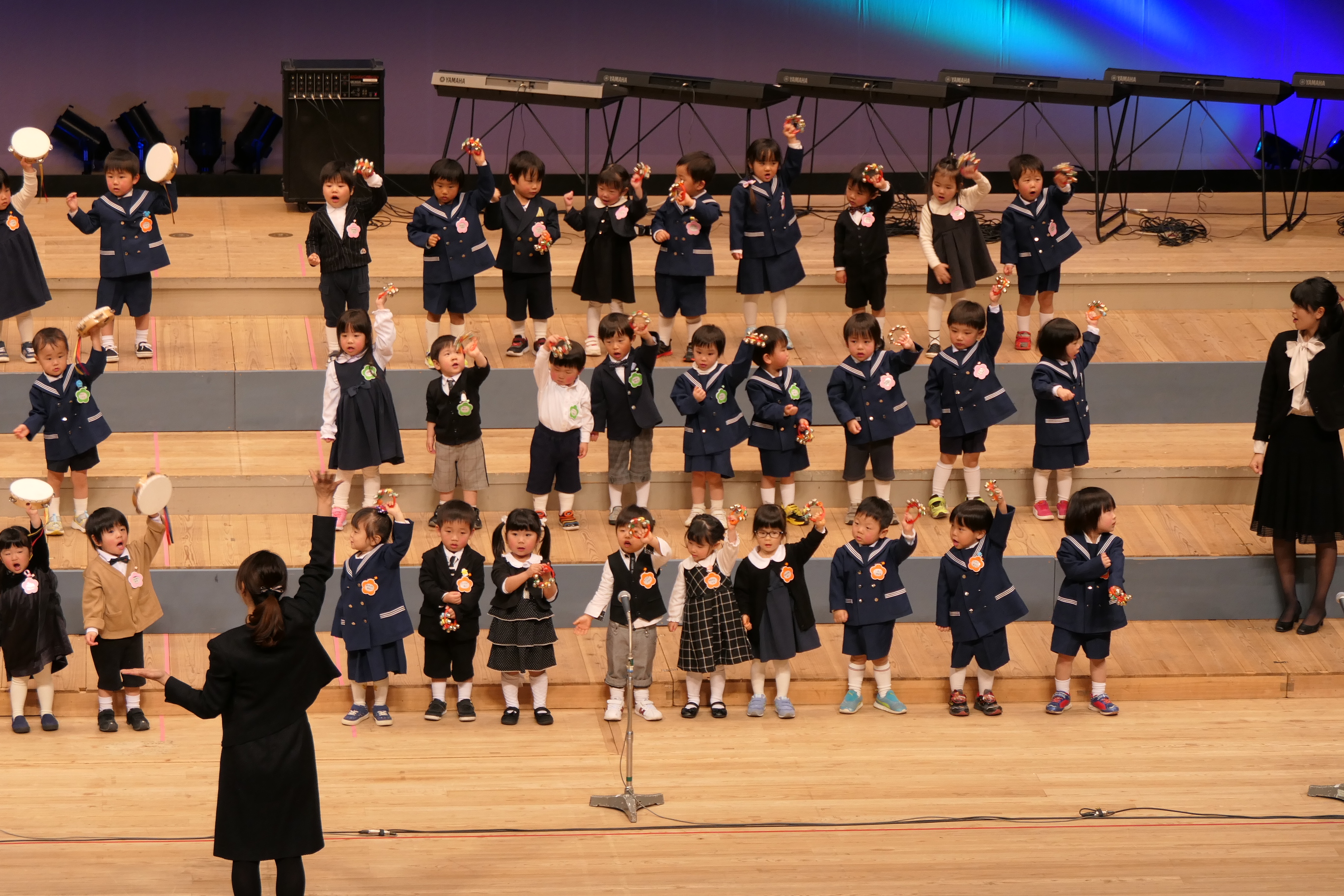 市民会館の大ホールで、みんな元気いっぱい歌い、リズムをとり、楽器を演奏しました。ちょっぴり緊張したけど、楽しかった!