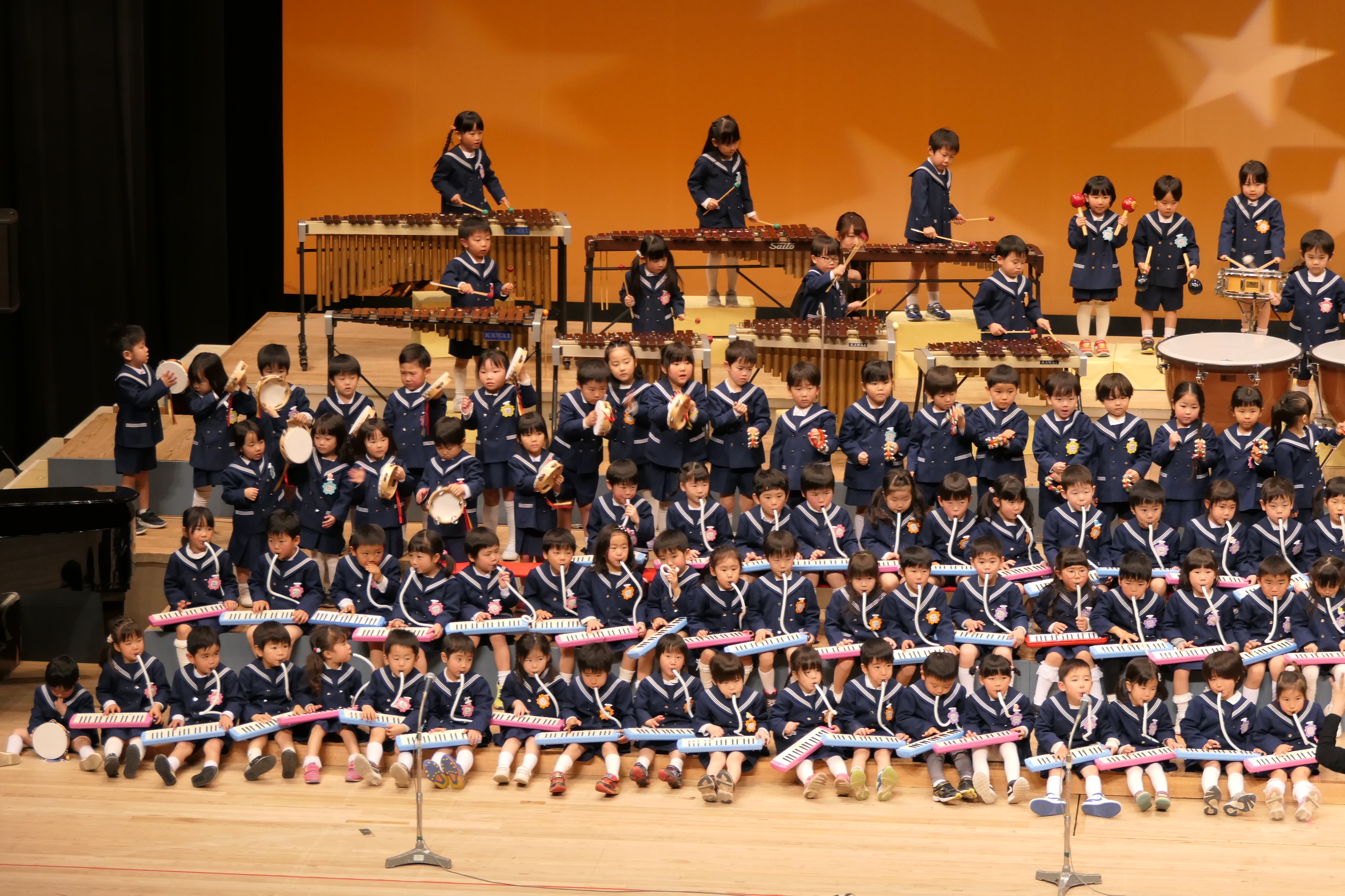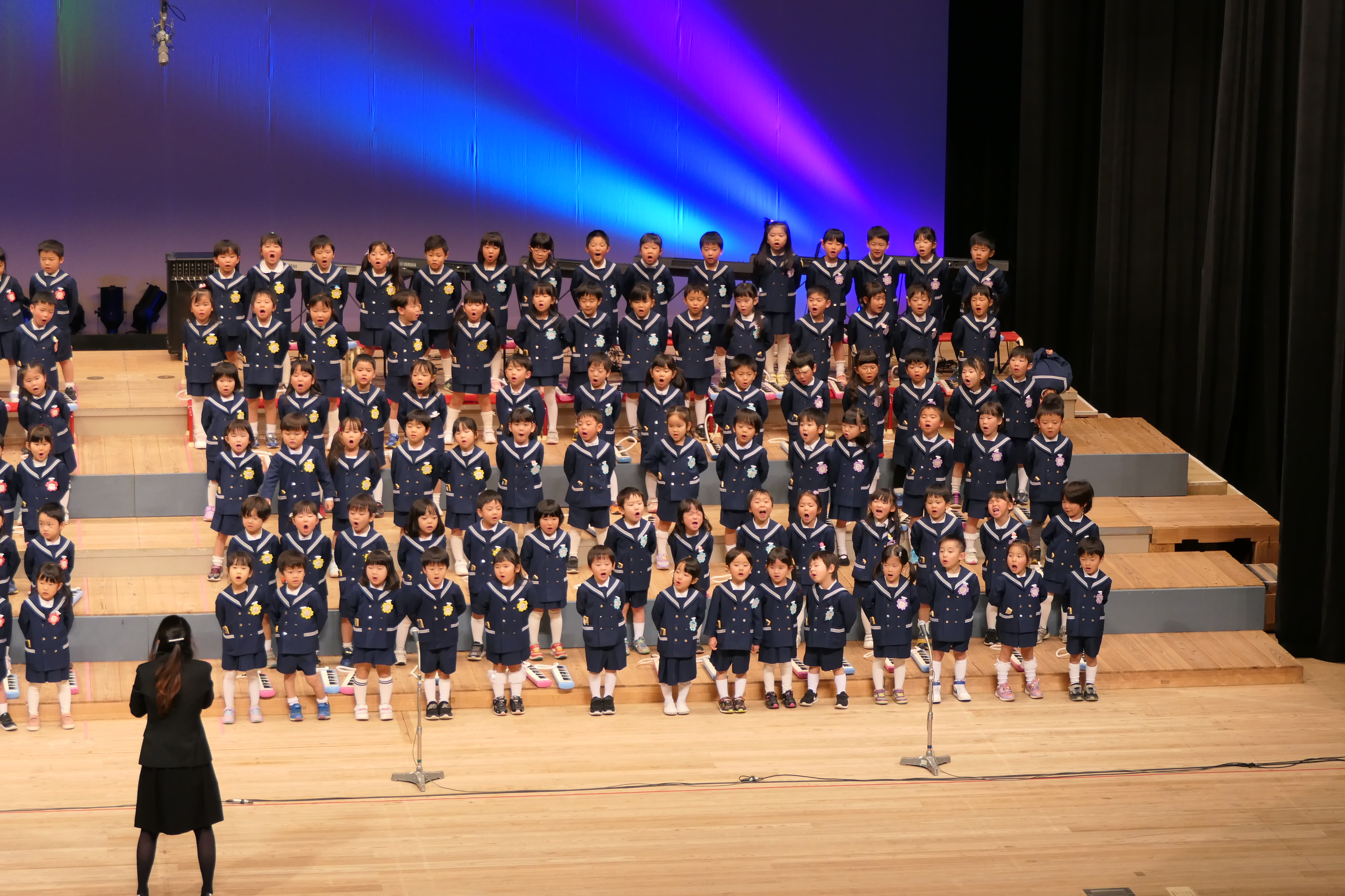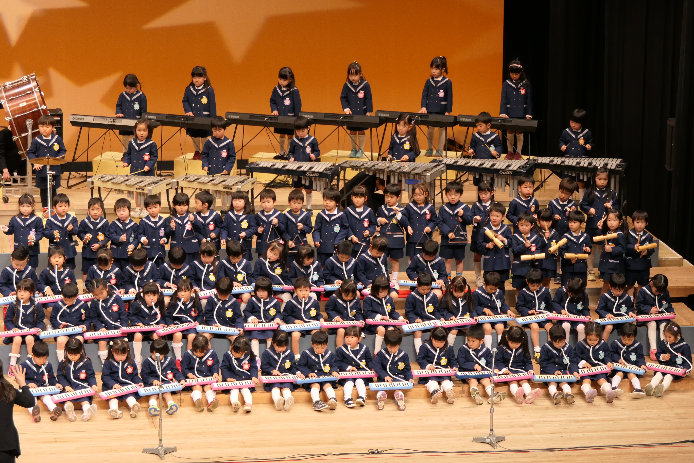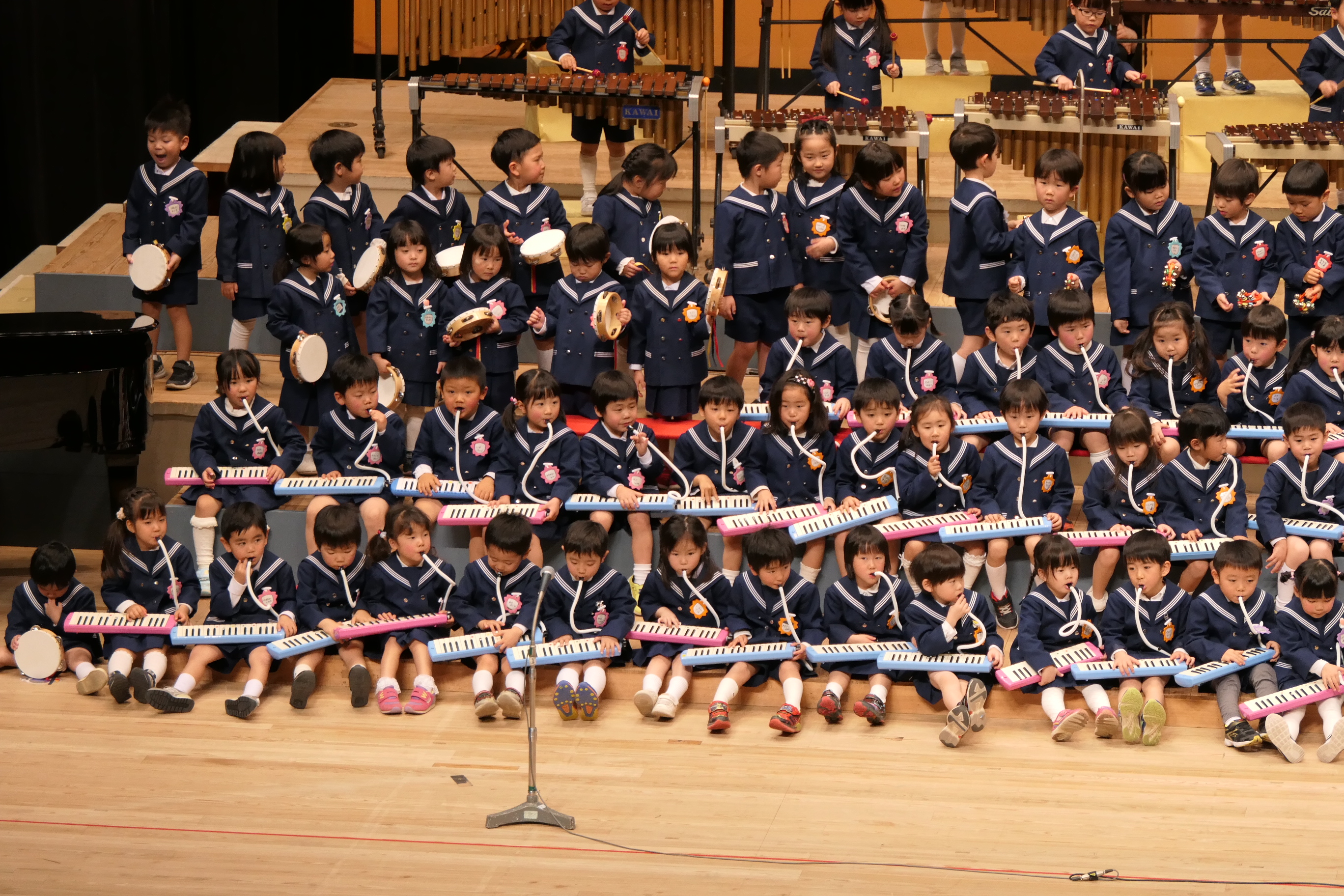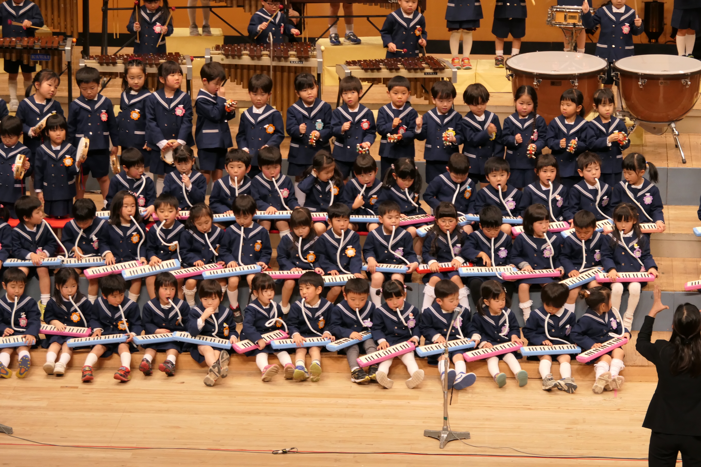 市民会館の大ホールで、みんな元気いっぱい歌い、リズムをとり、楽器を演奏しました。ちょっぴり緊張したけど、楽しかった!