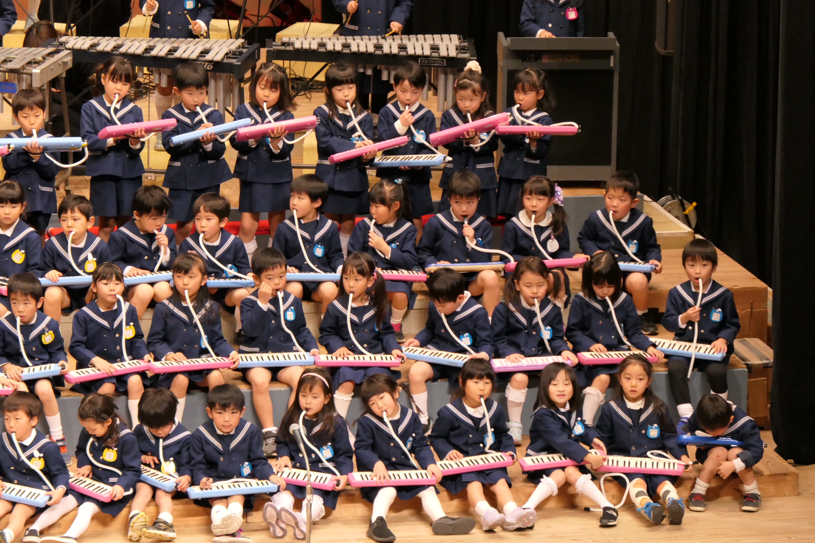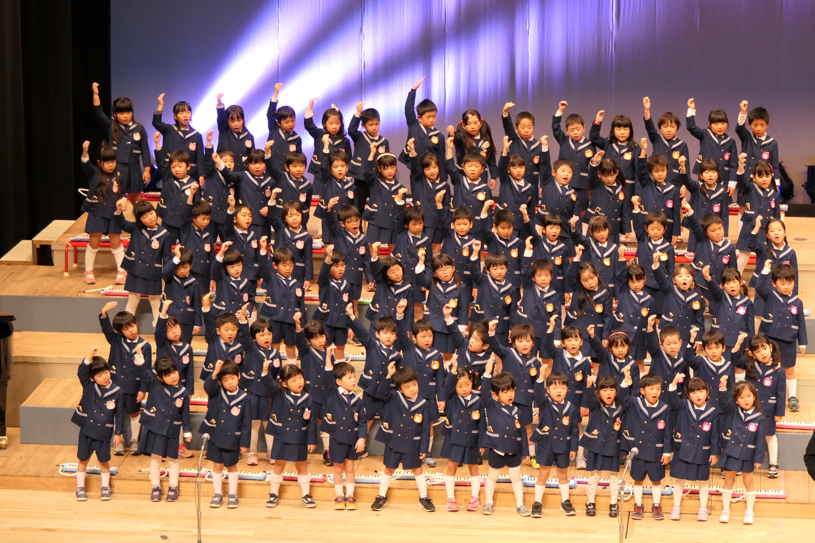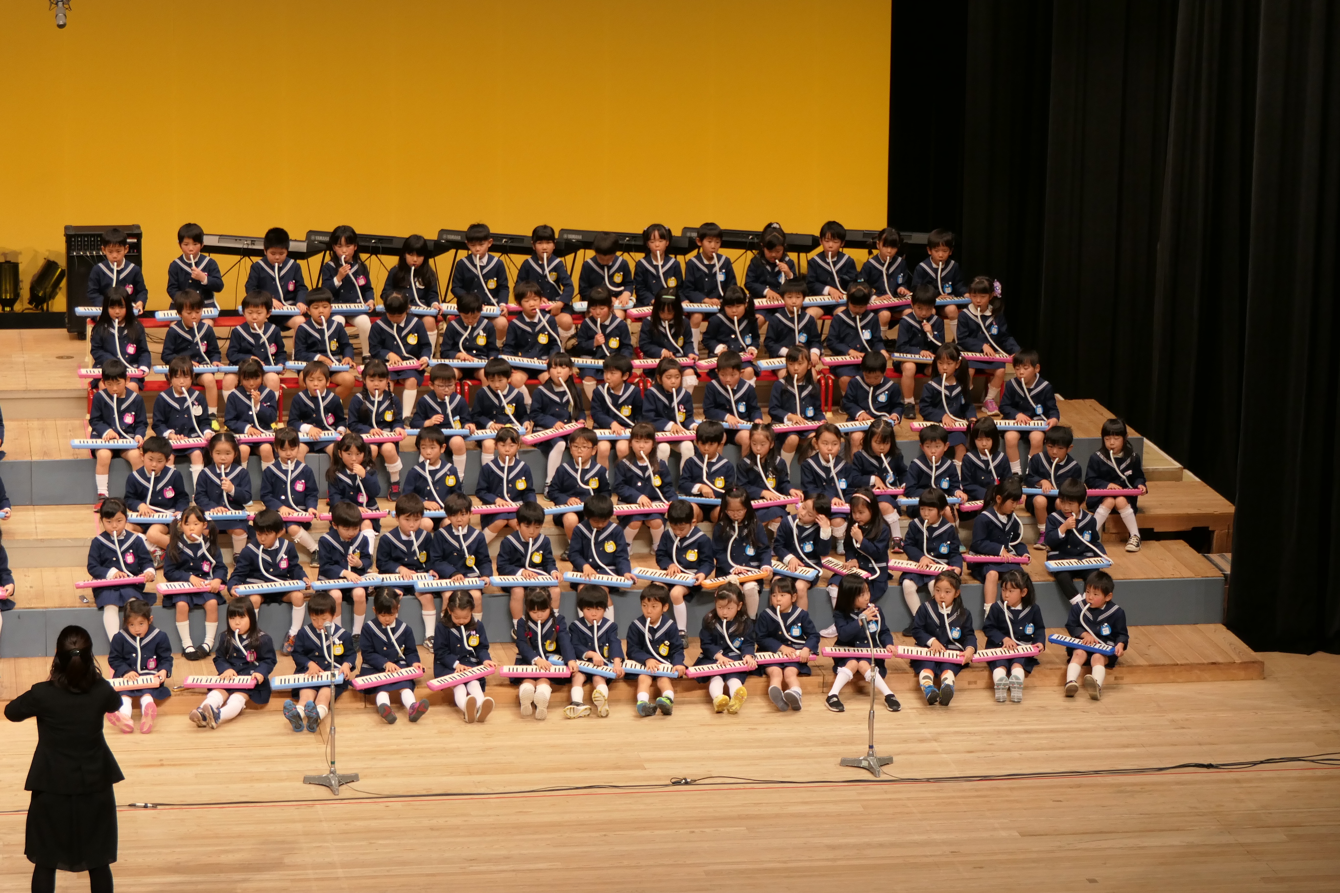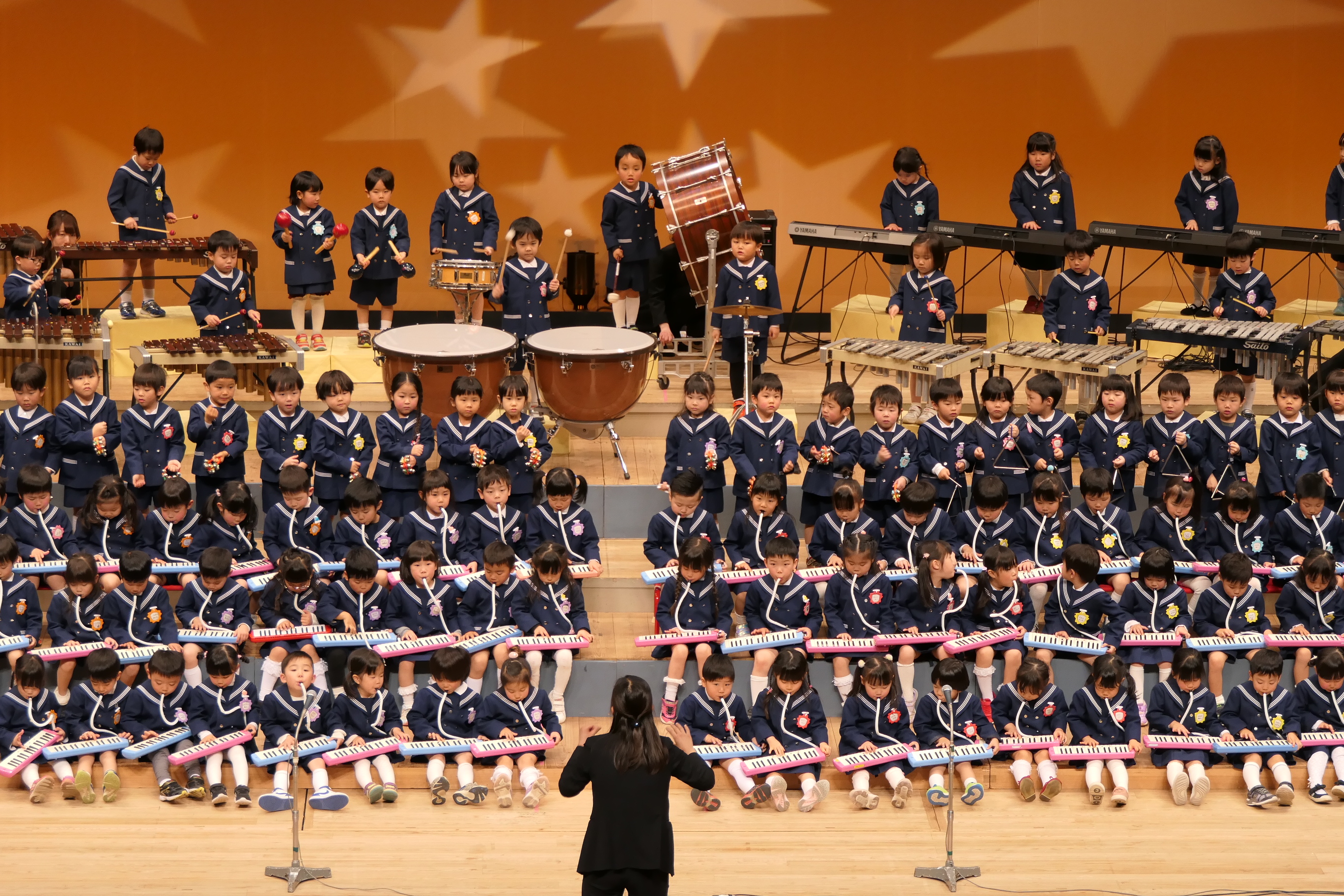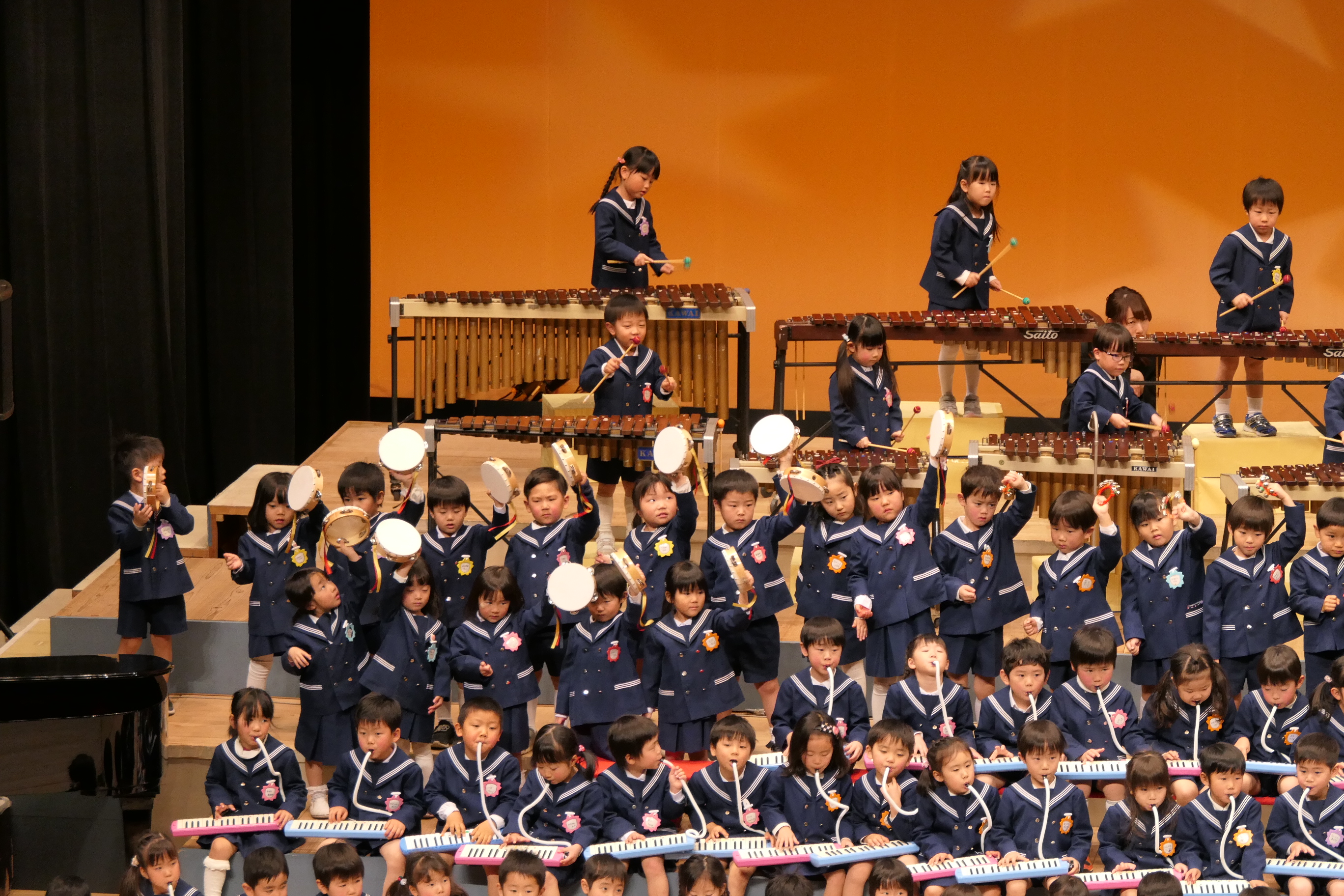 市民会館の大ホールで、みんな元気いっぱい歌い、リズムをとり、楽器を演奏しました。ちょっぴり緊張したけど、楽しかった!