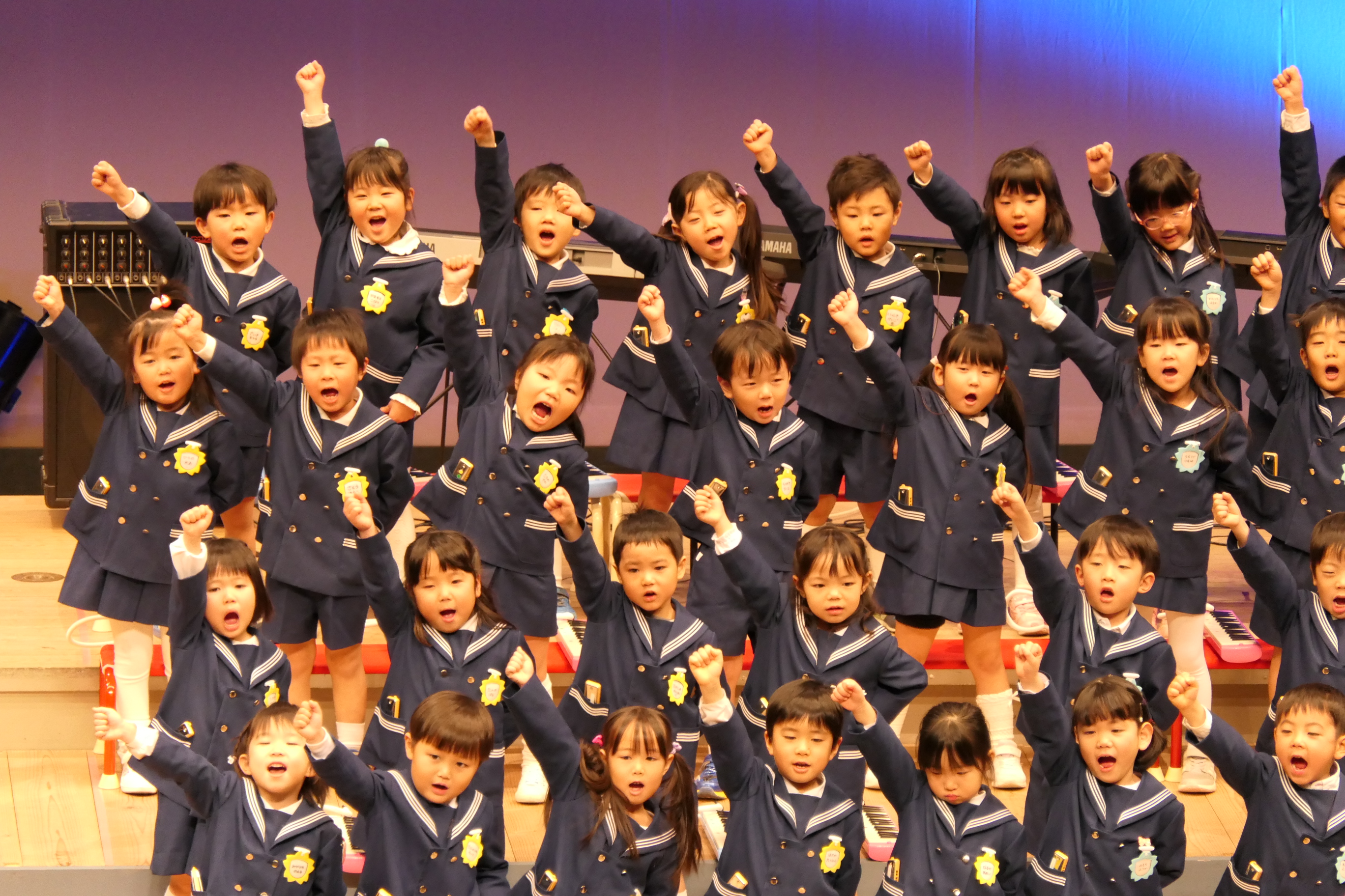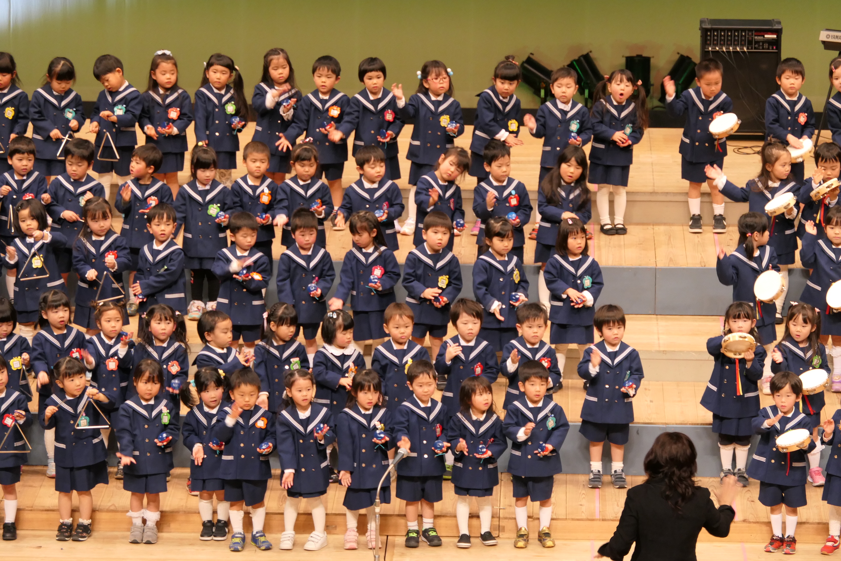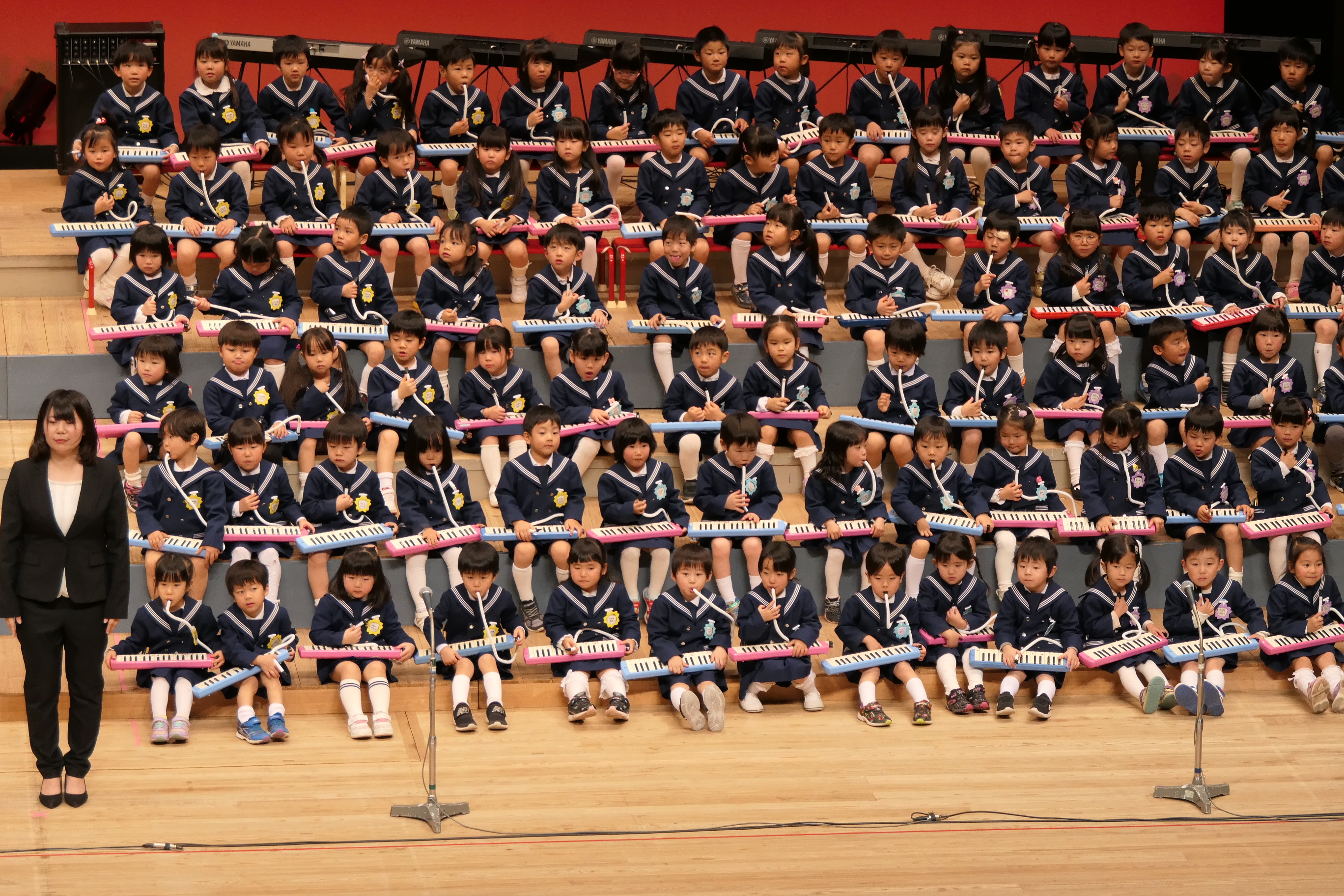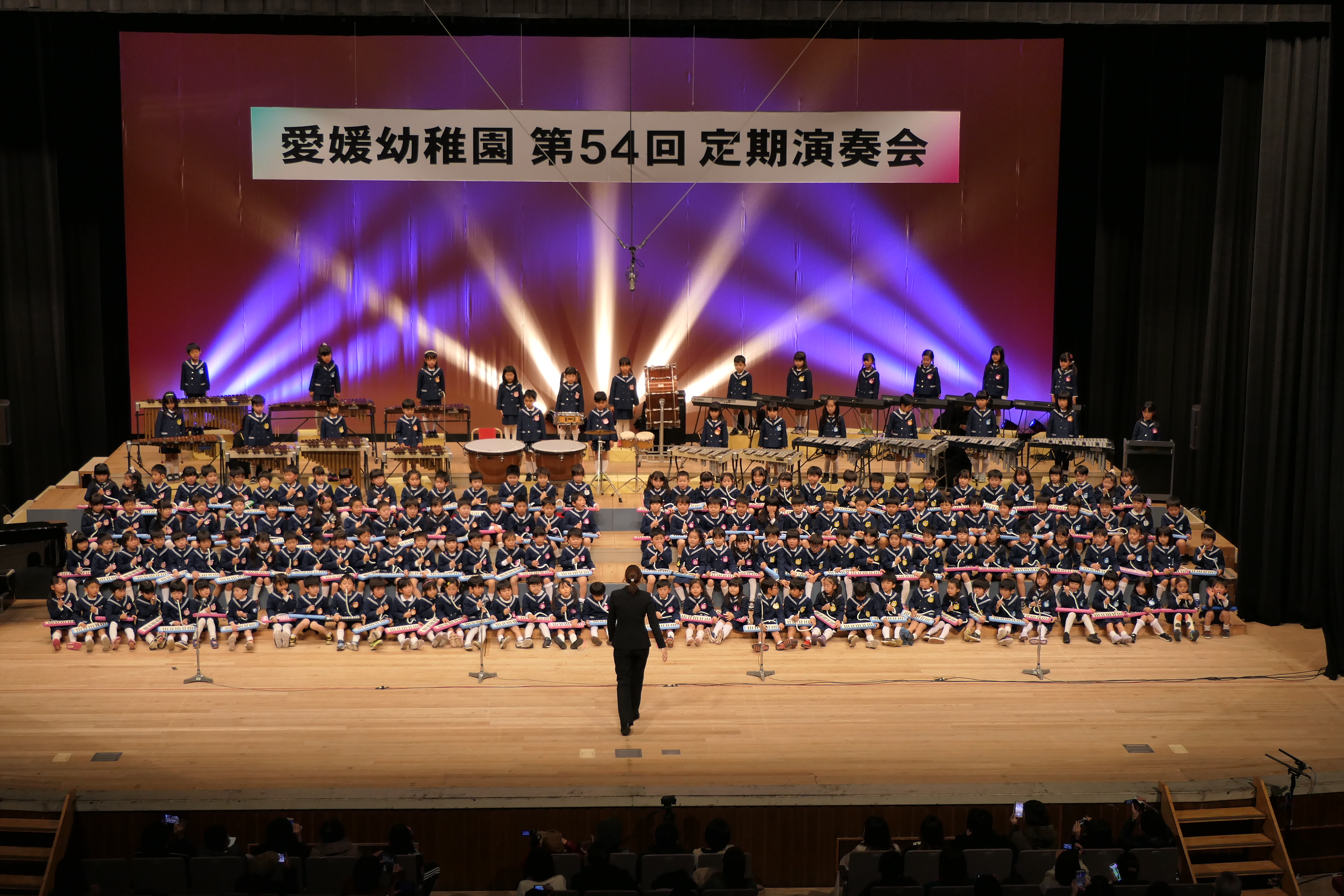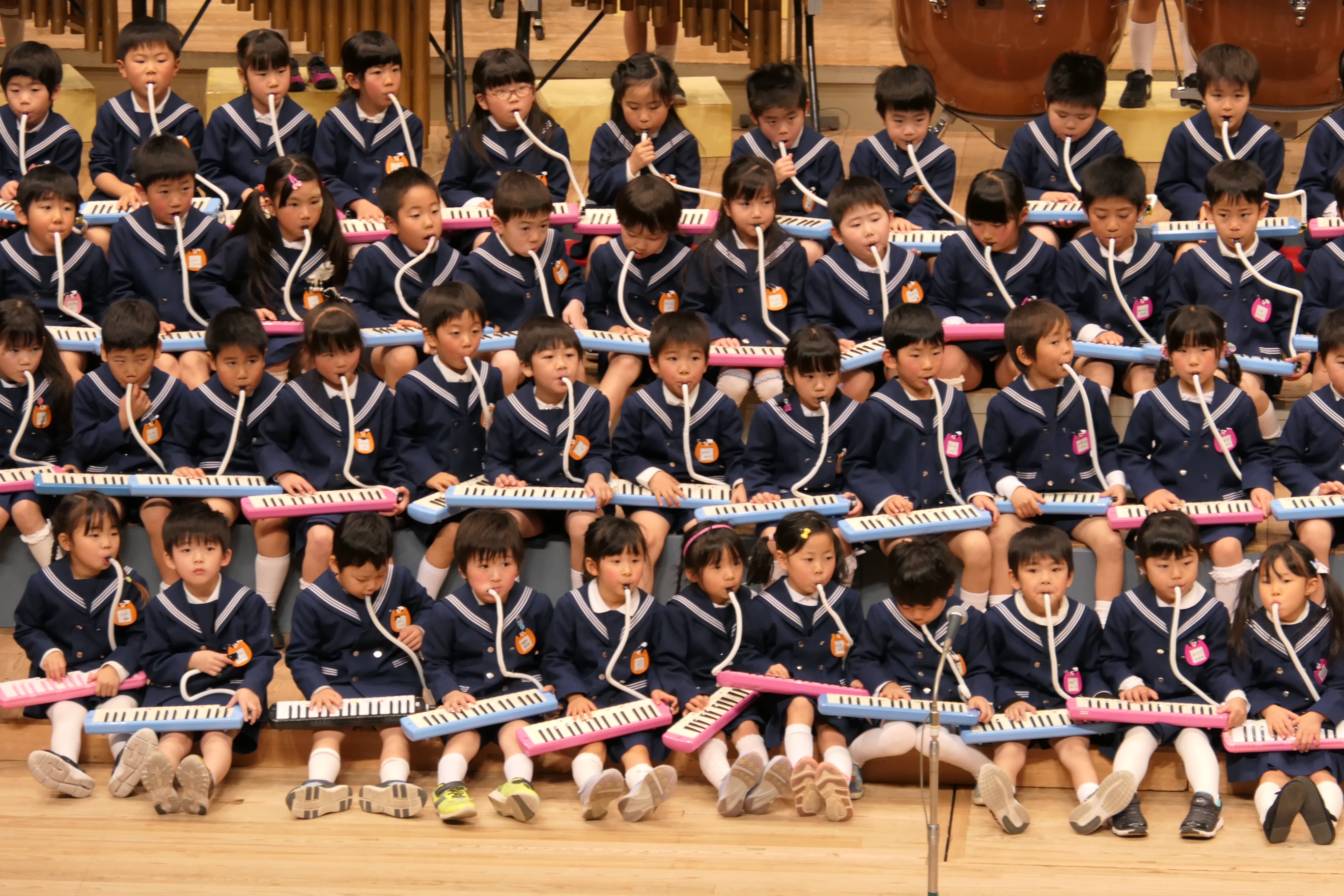 市民会館の大ホールで、みんな元気いっぱい歌い、リズムをとり、楽器を演奏しました。ちょっぴり緊張したけど、楽しかった!
