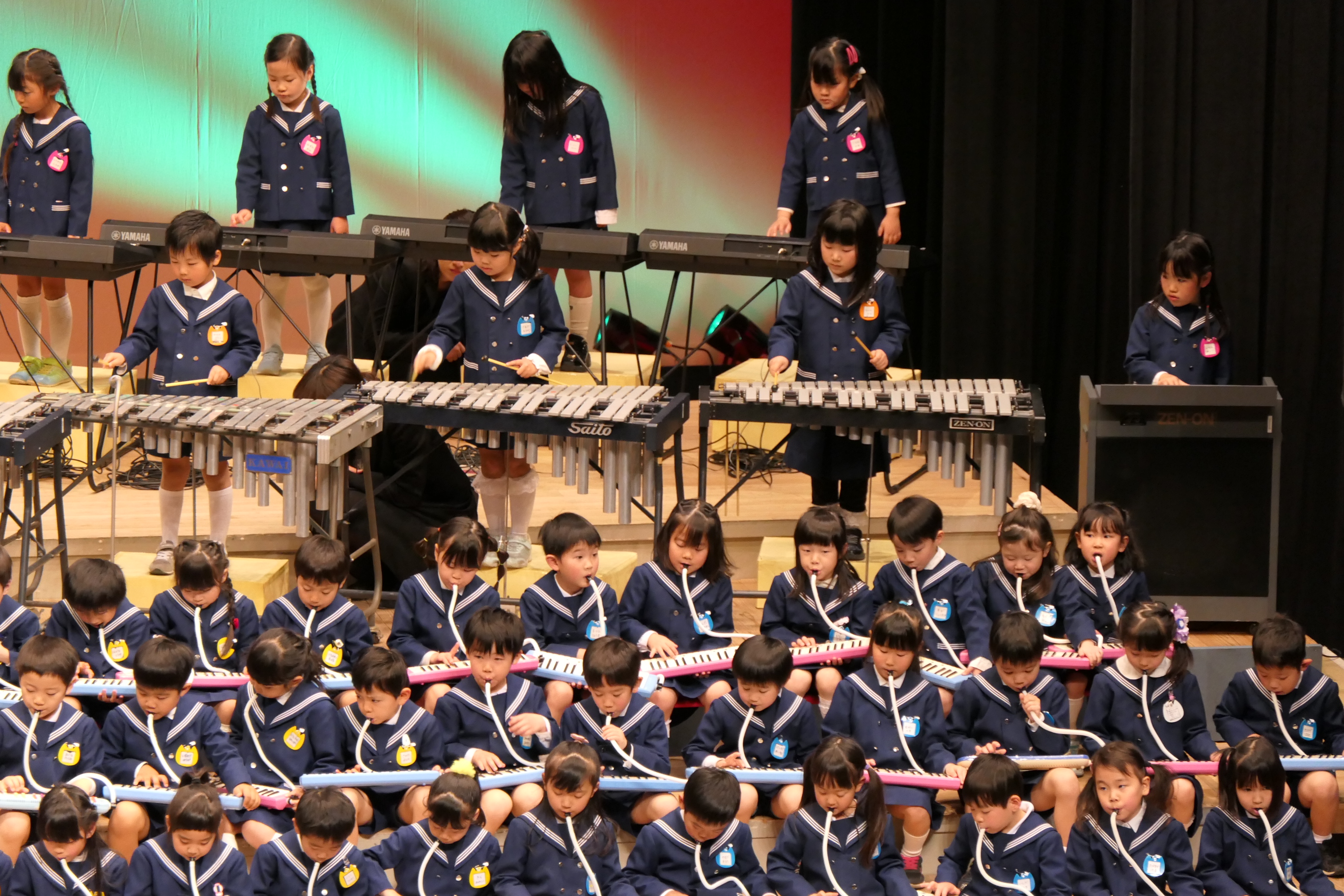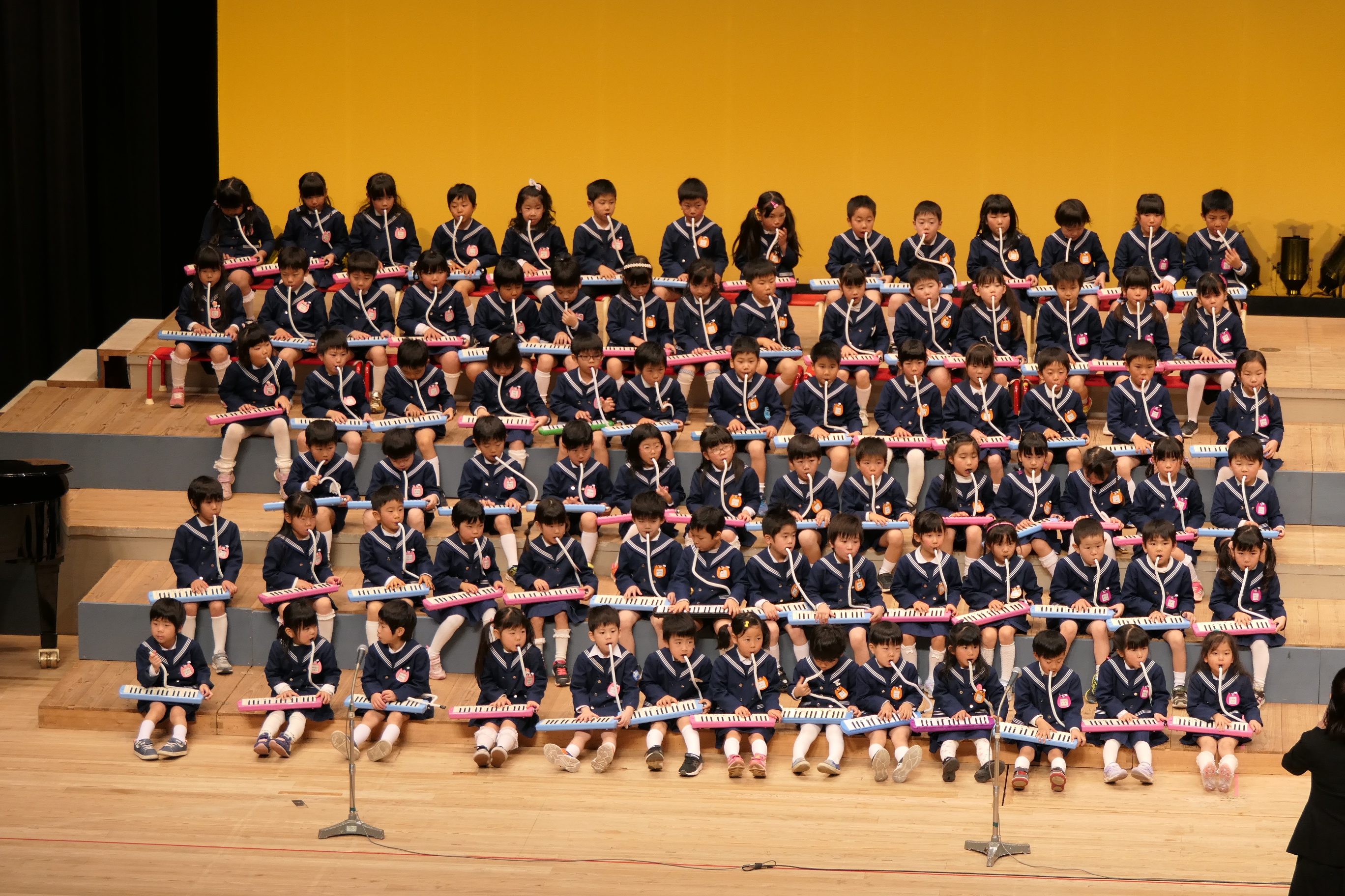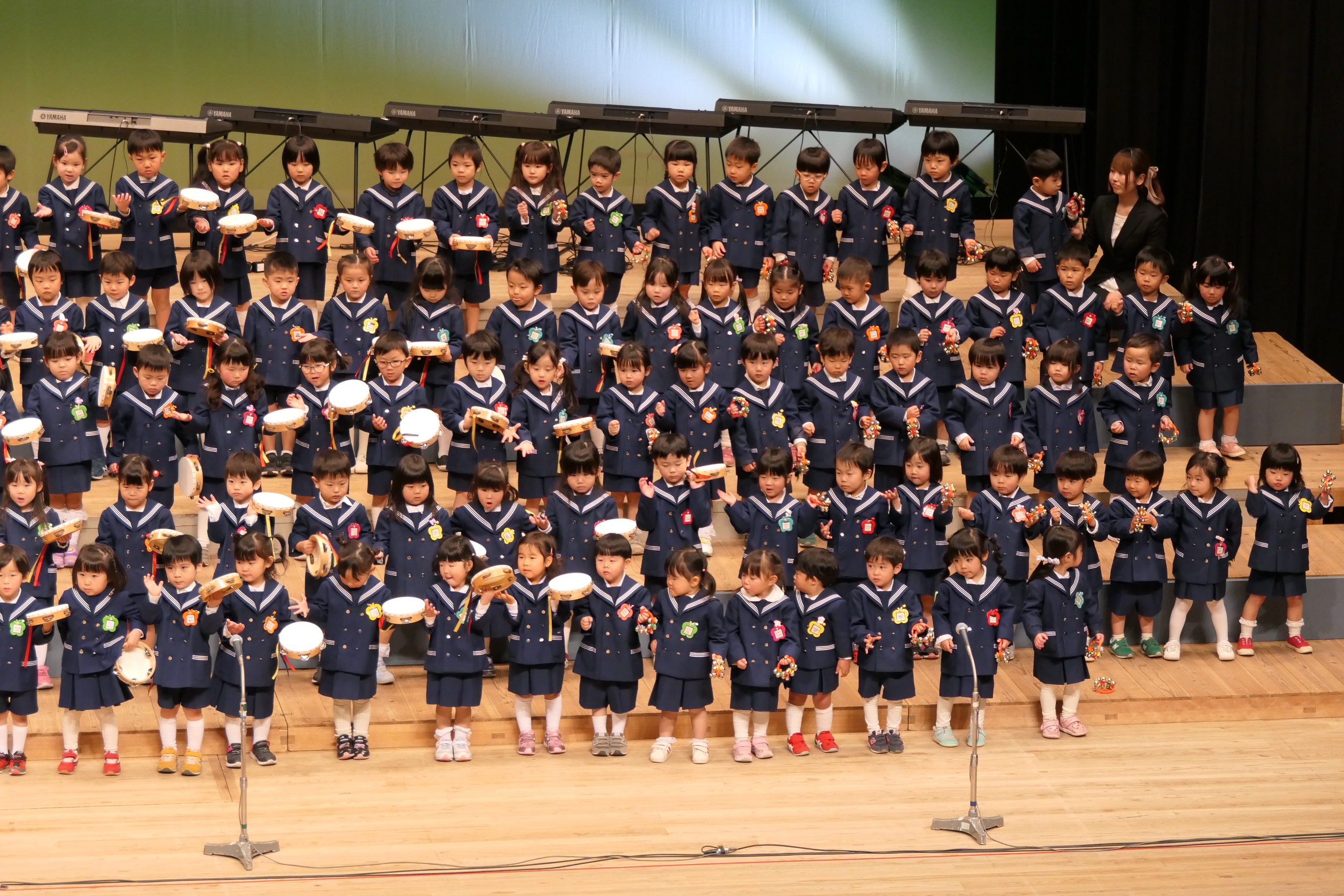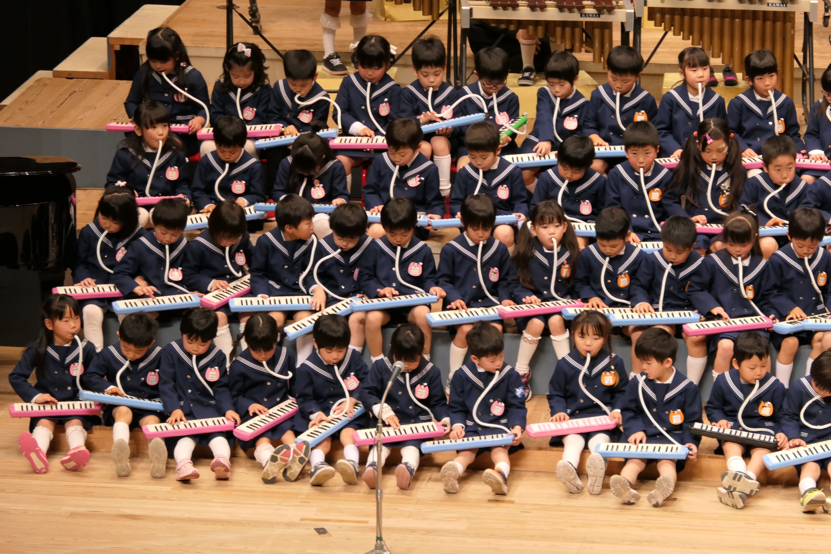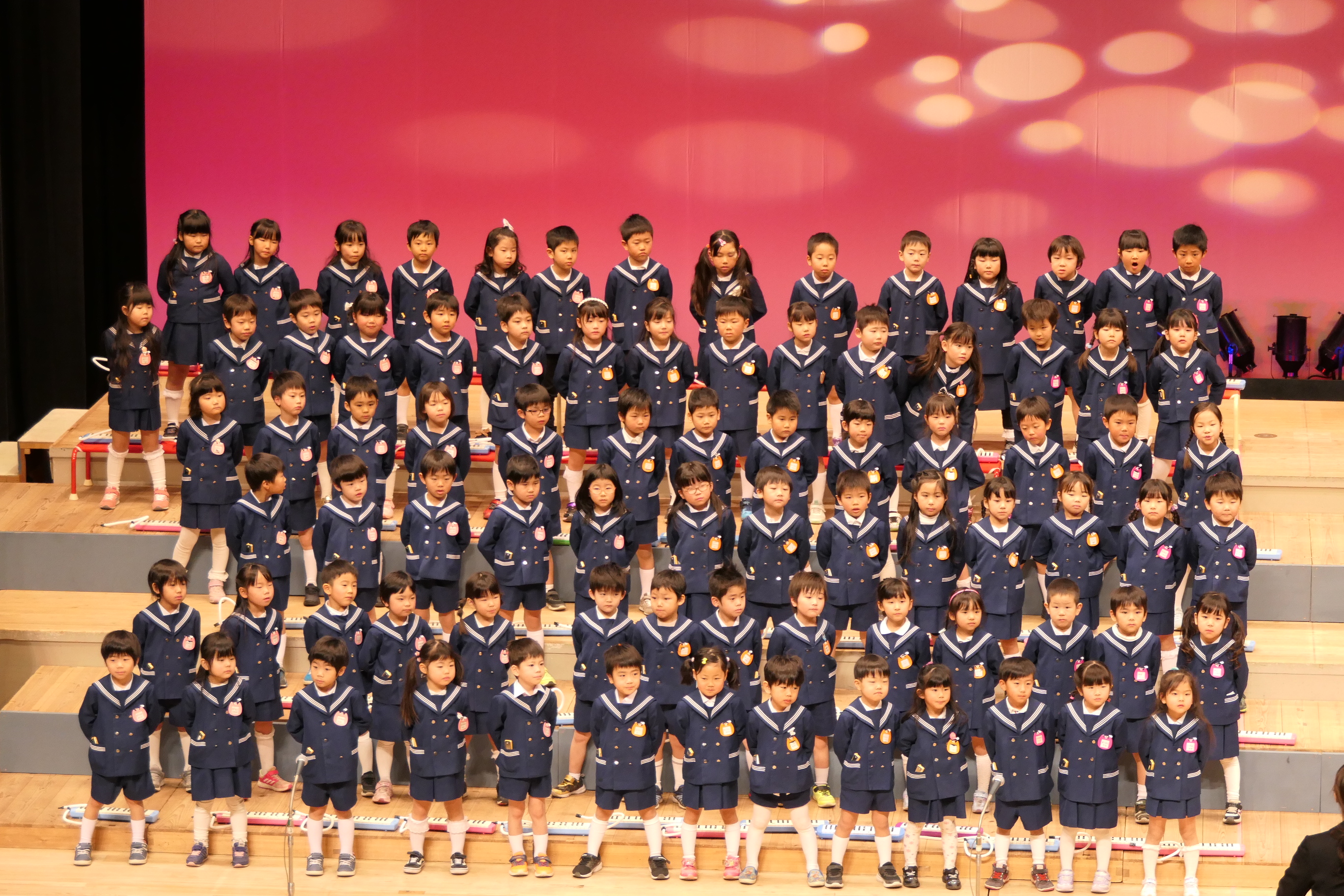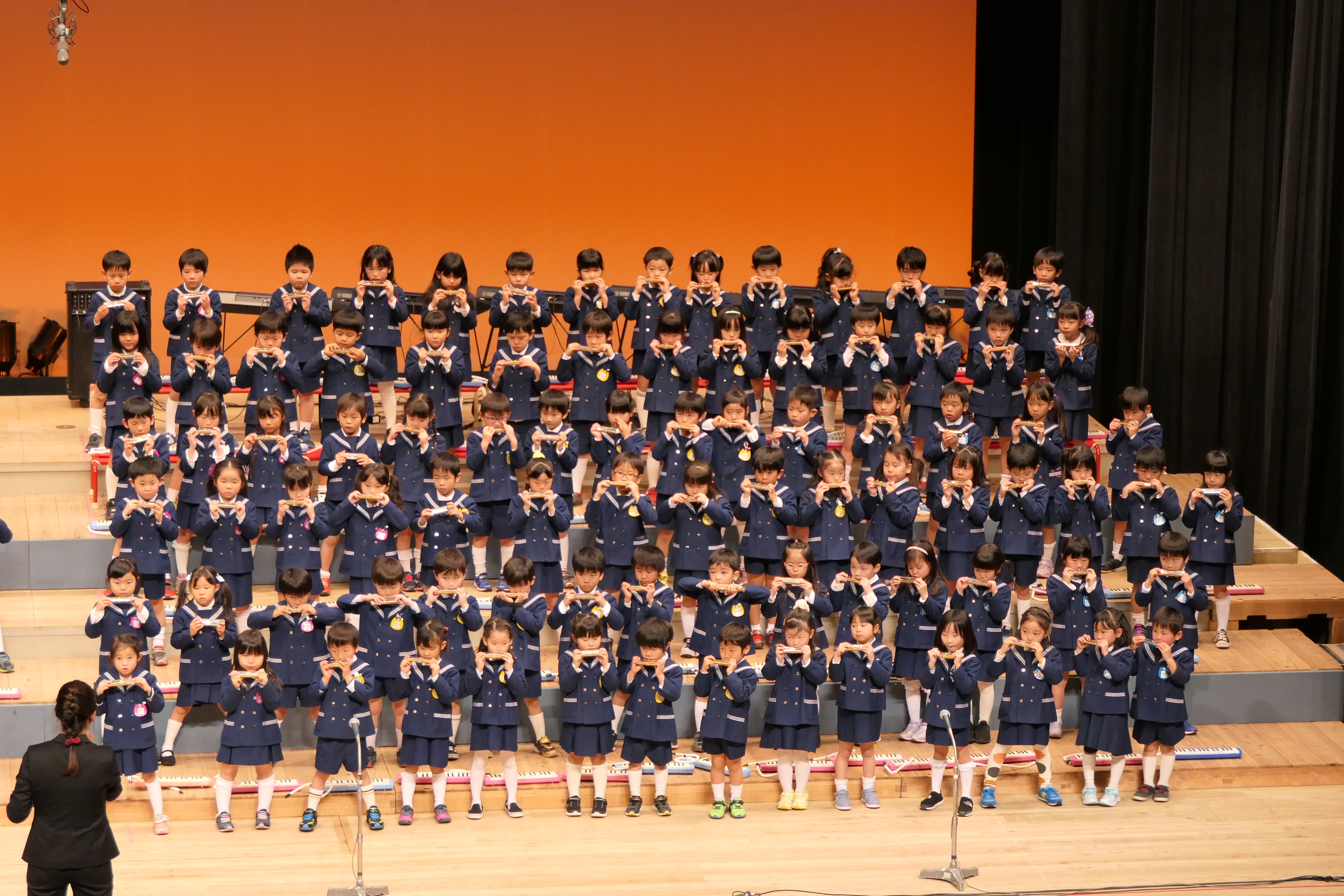 市民会館の大ホールで、みんな元気いっぱい歌い、リズムをとり、楽器を演奏しました。ちょっぴり緊張したけど、楽しかった!
