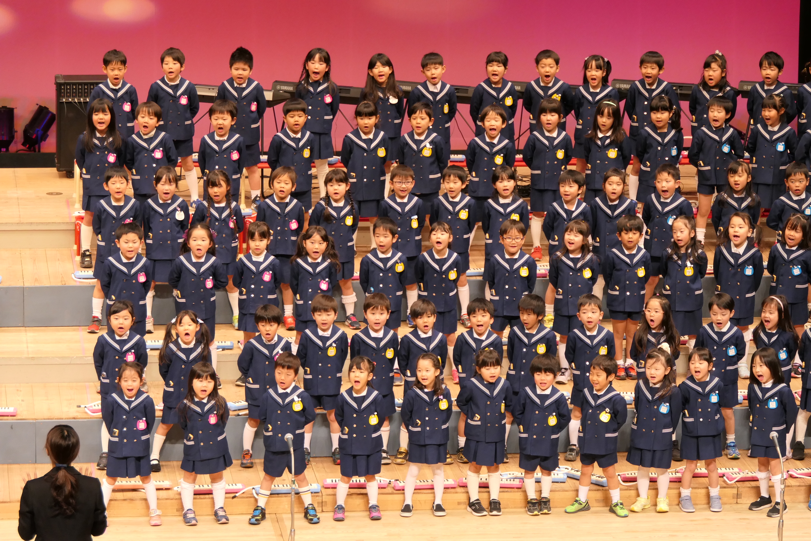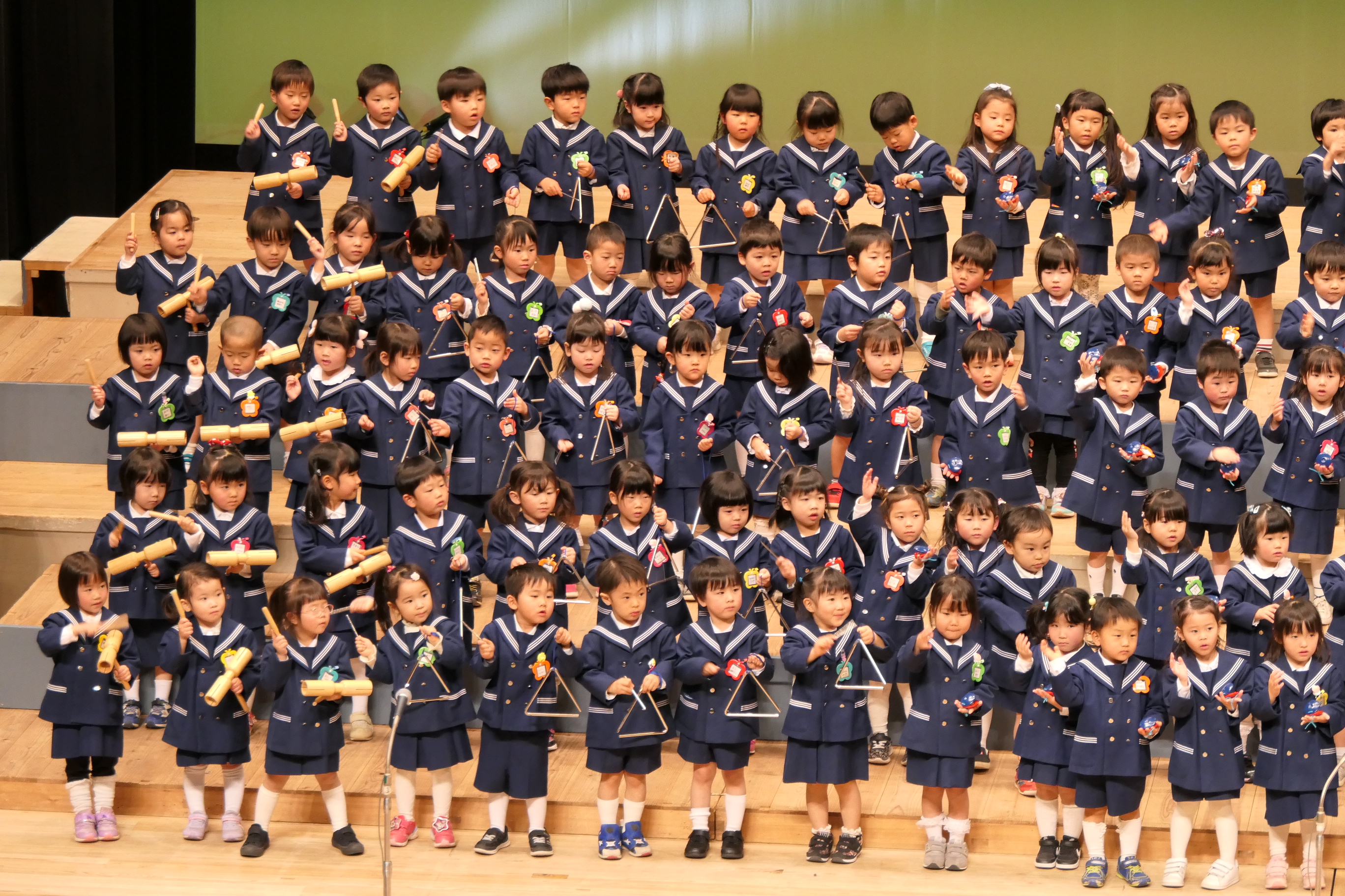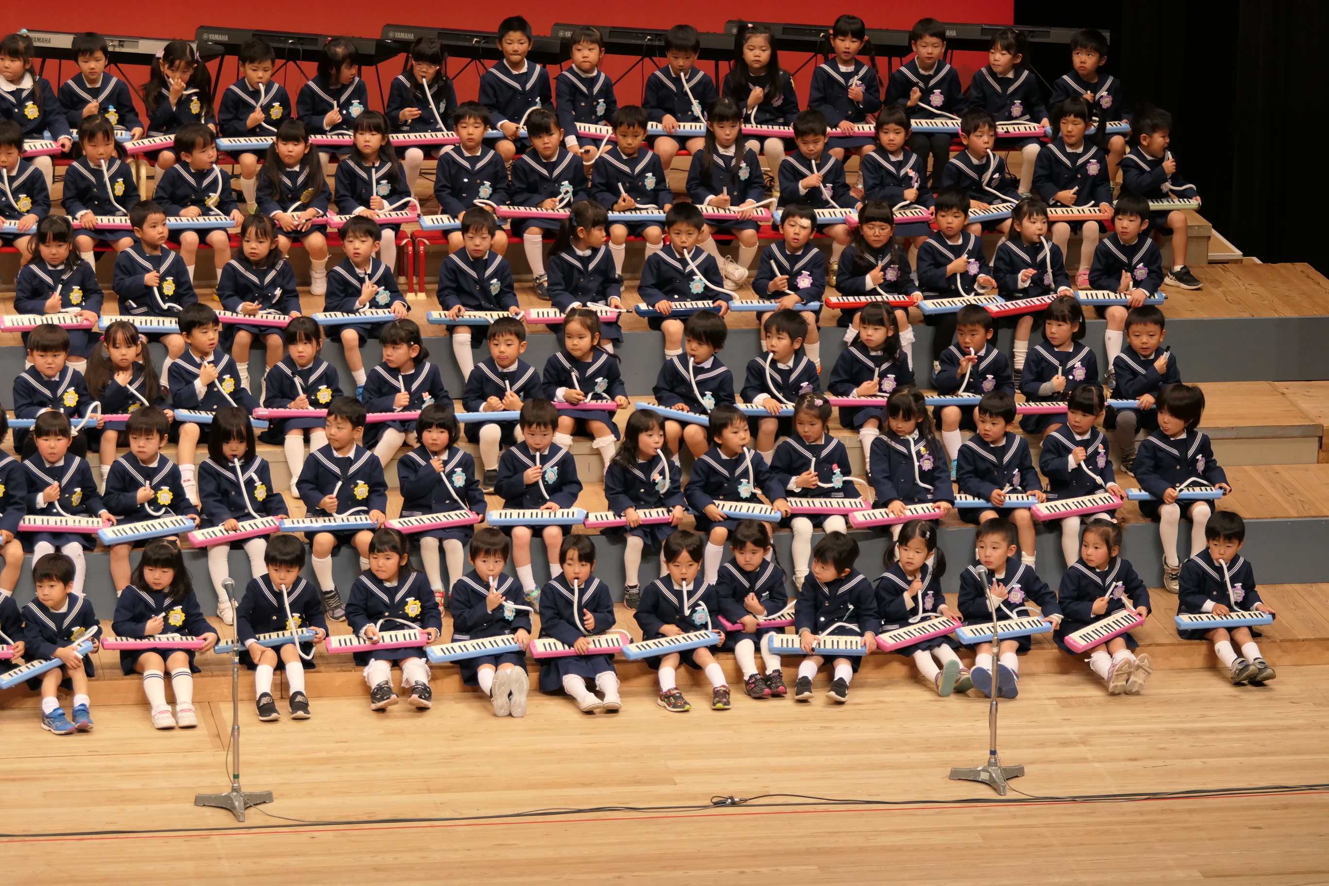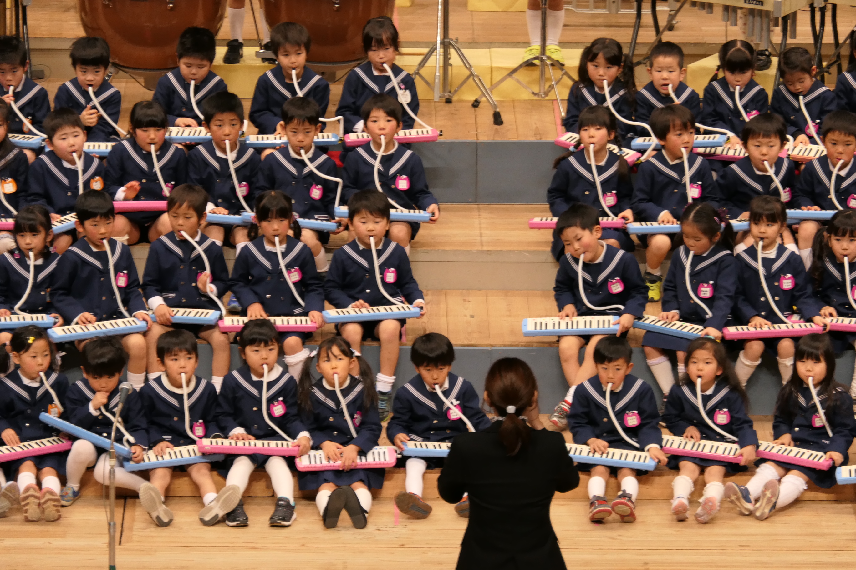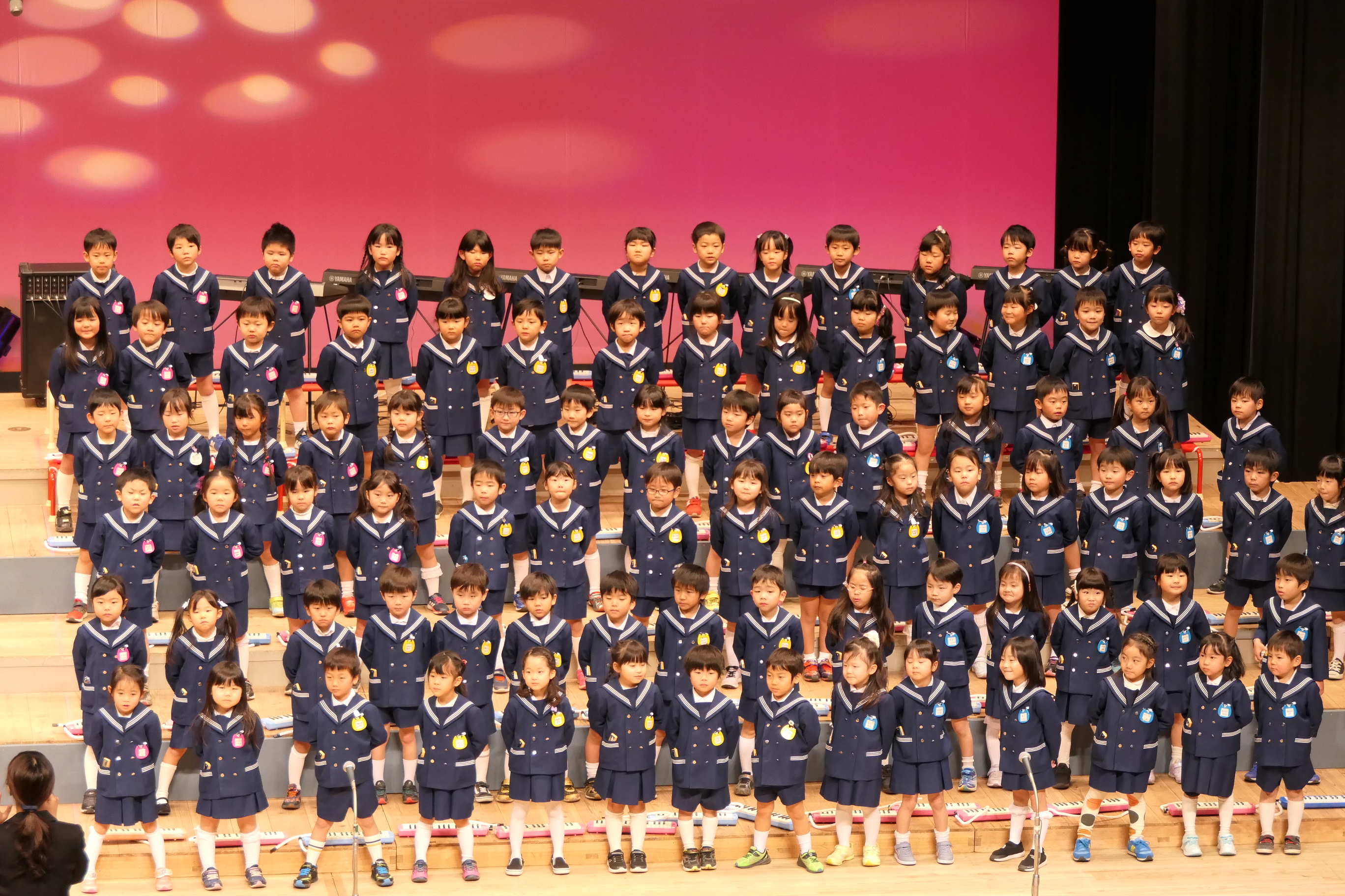 市民会館の大ホールで、みんな元気いっぱい歌い、リズムをとり、楽器を演奏しました。ちょっぴり緊張したけど、楽しかった!