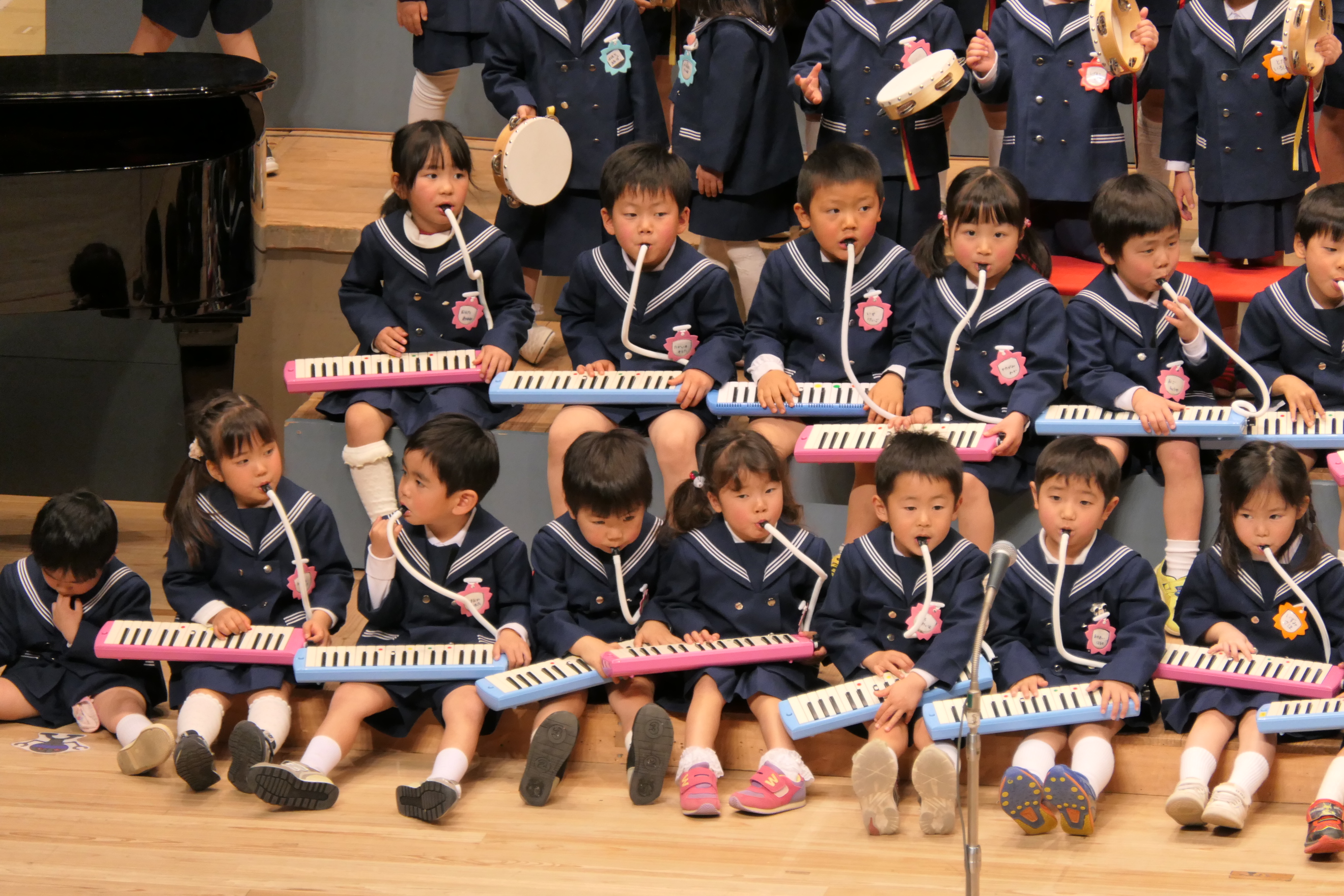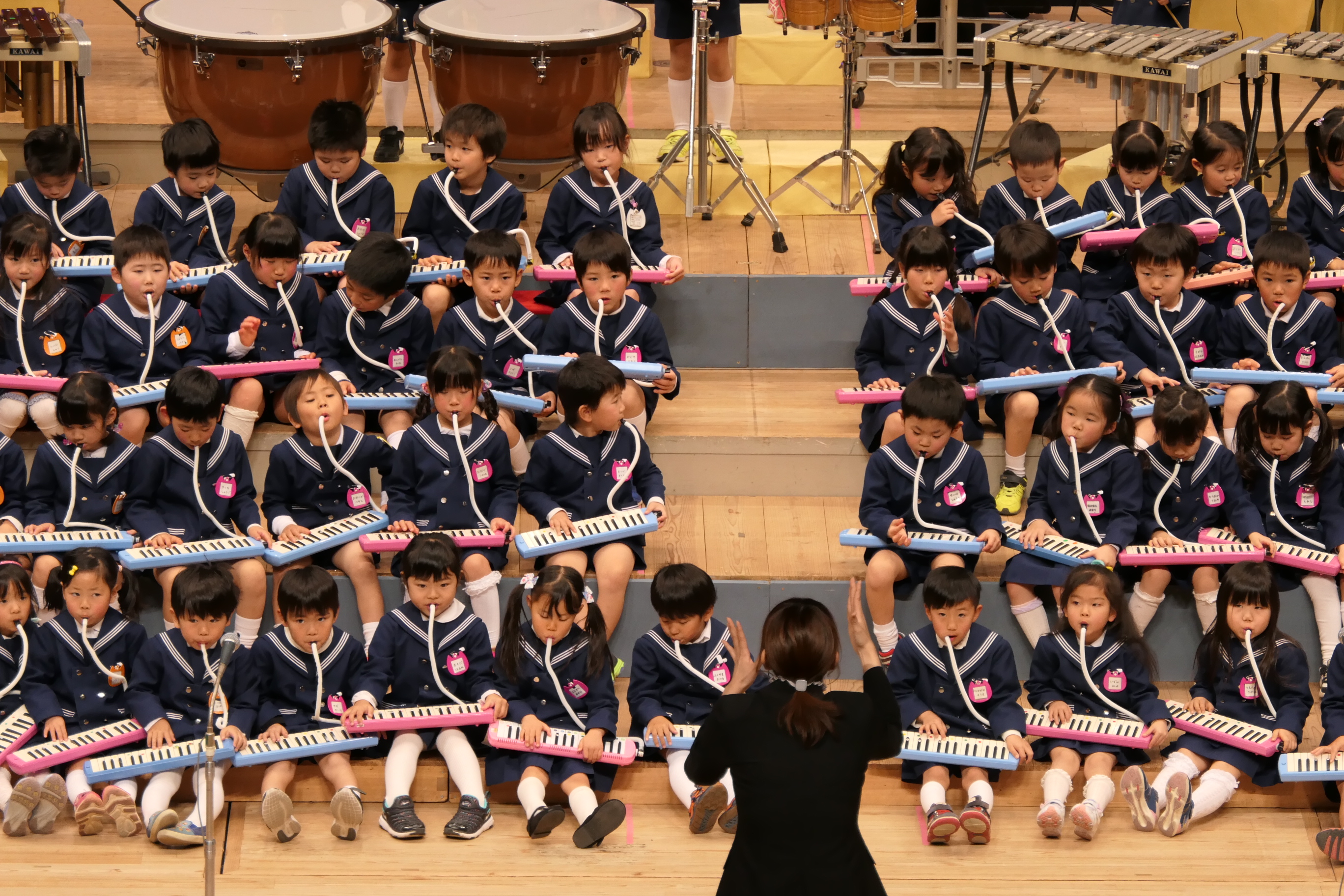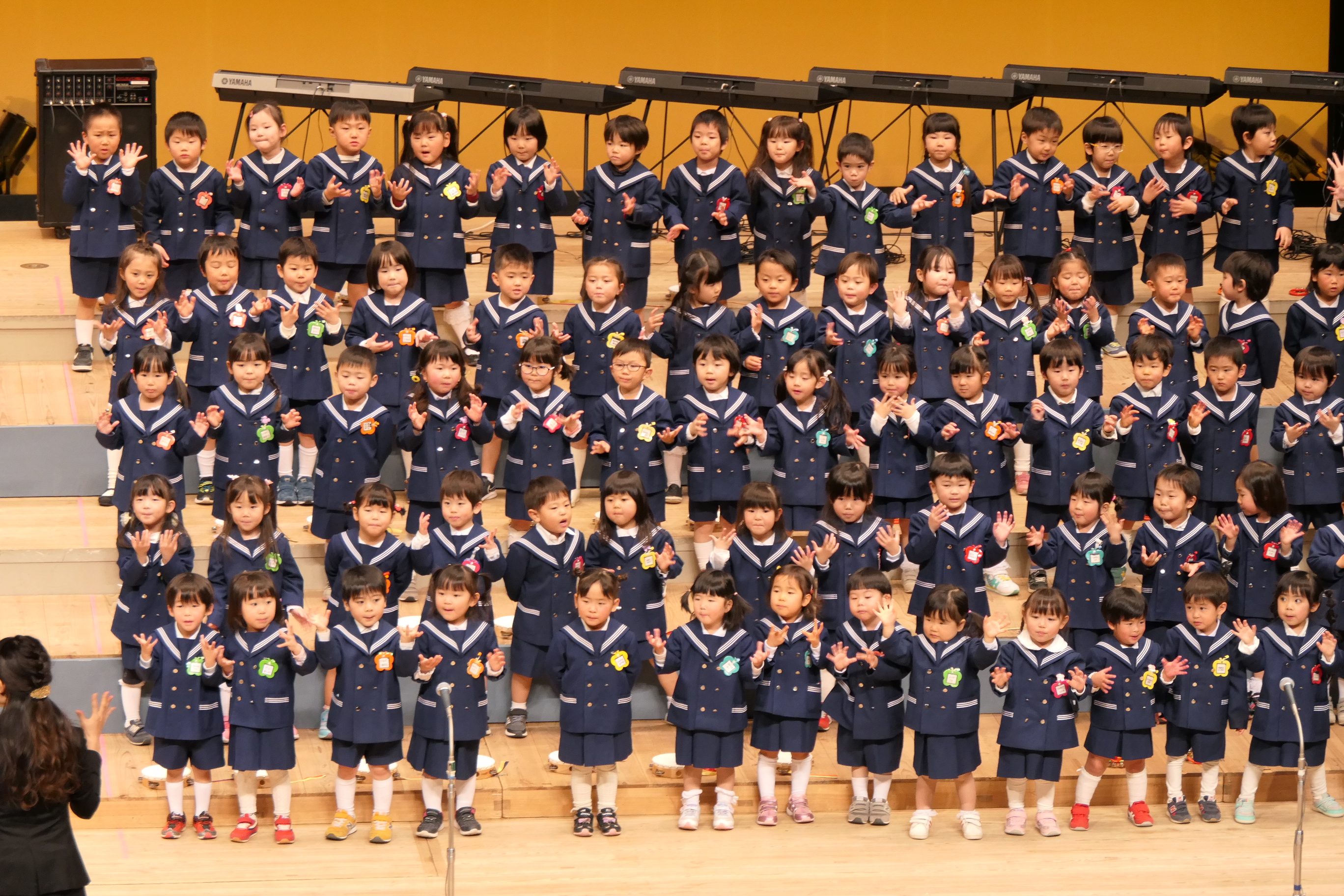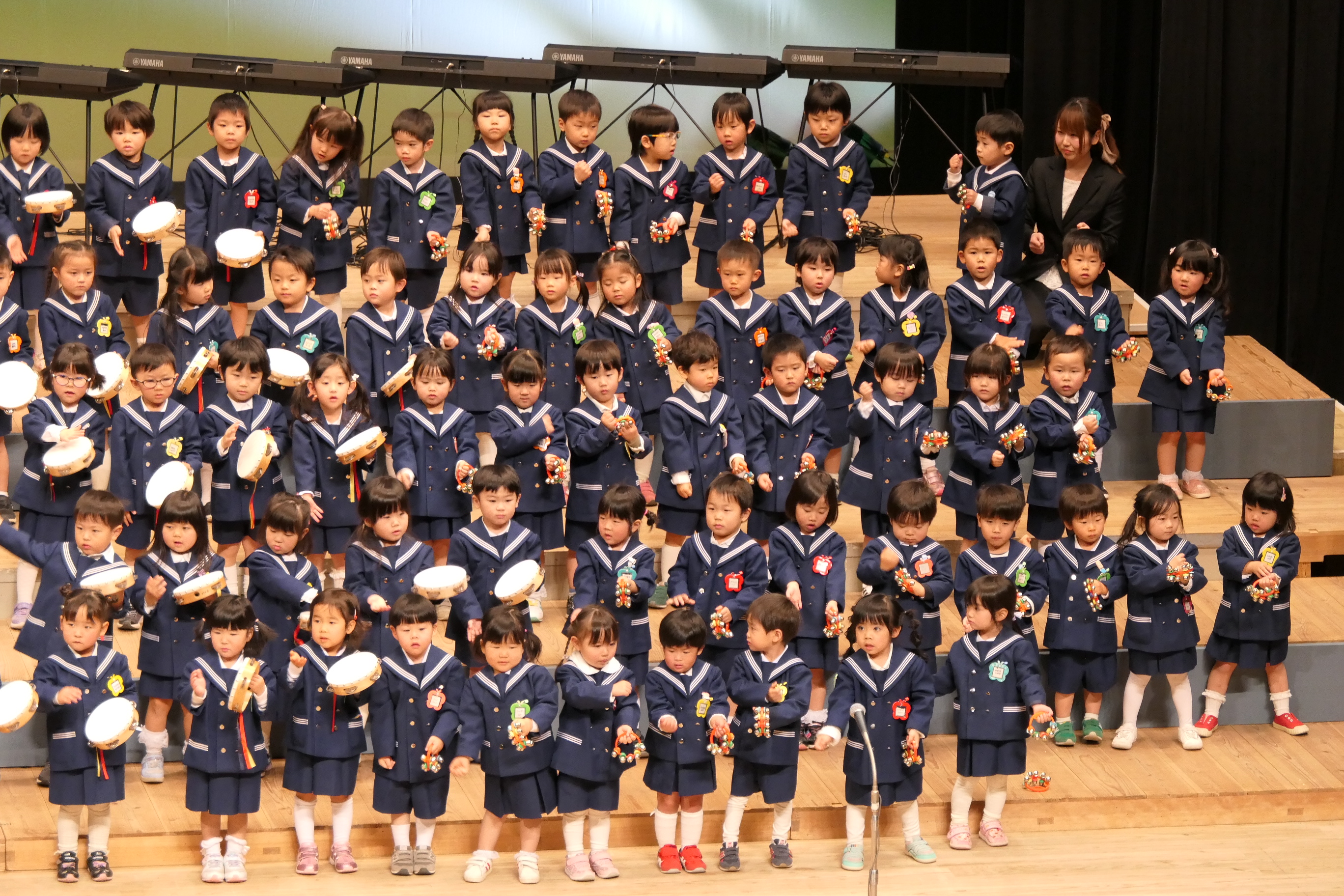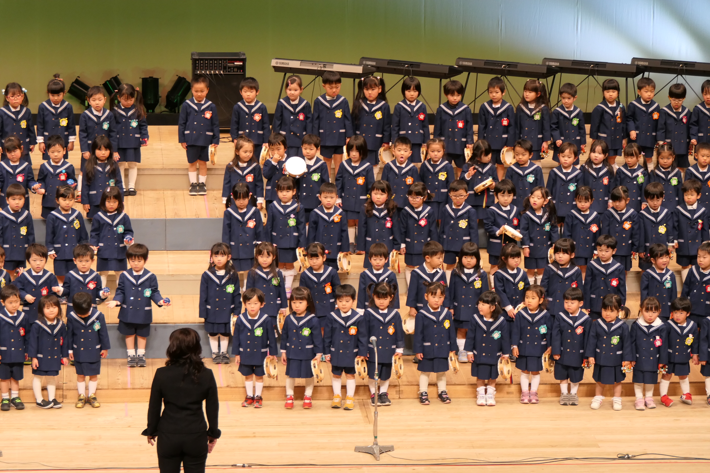 市民会館の大ホールで、みんな元気いっぱい歌い、リズムをとり、楽器を演奏しました。ちょっぴり緊張したけど、楽しかった!
