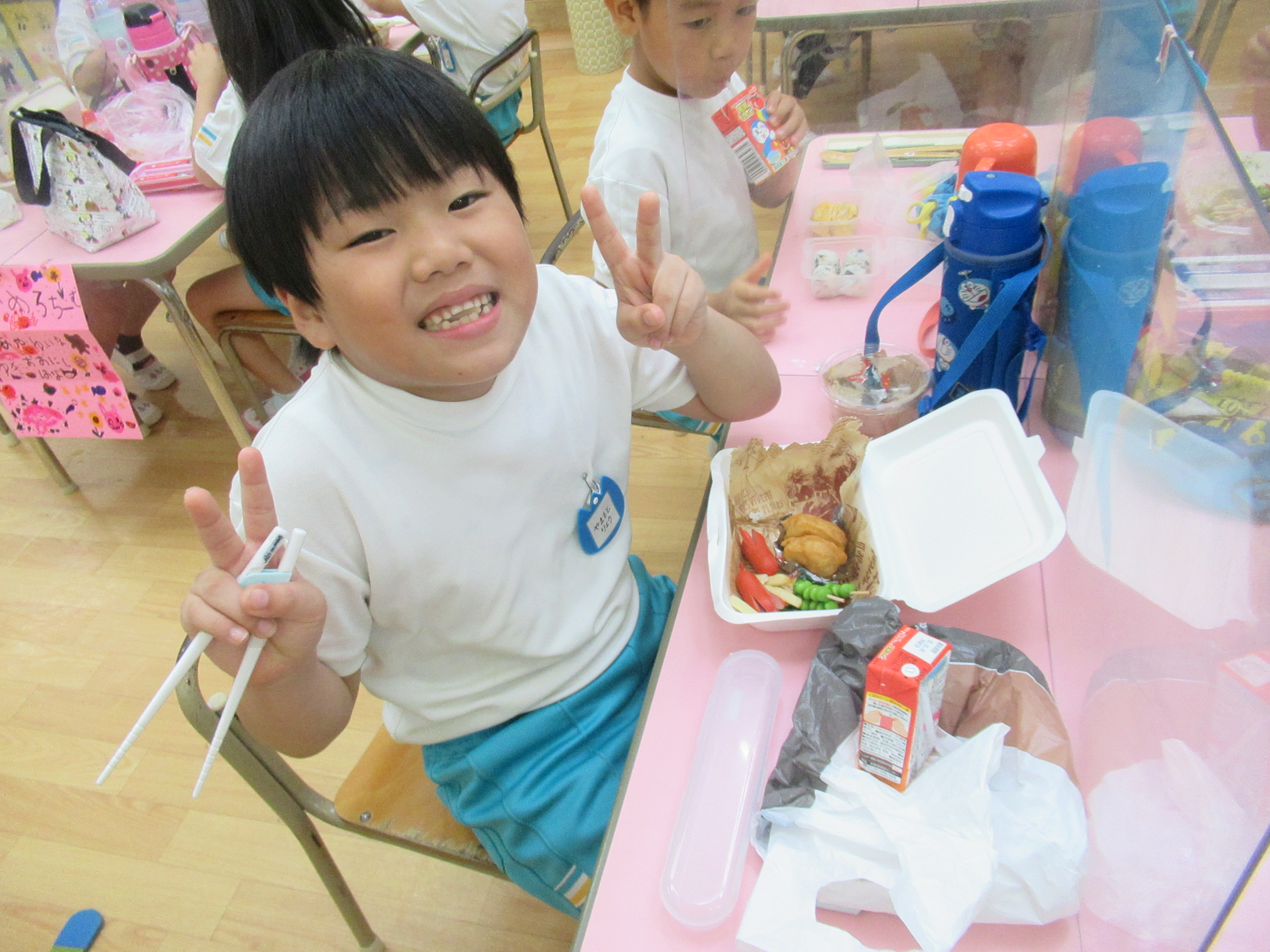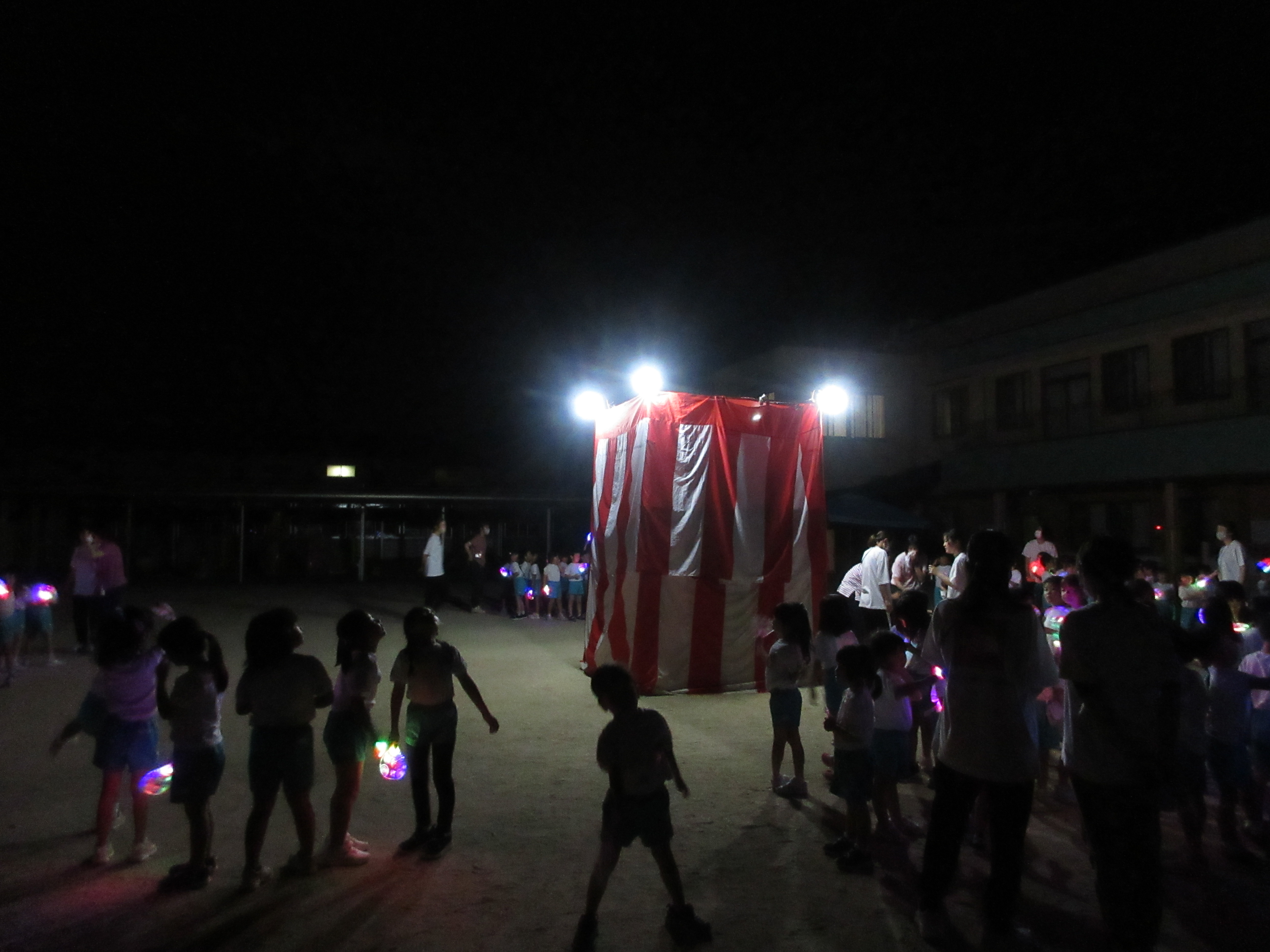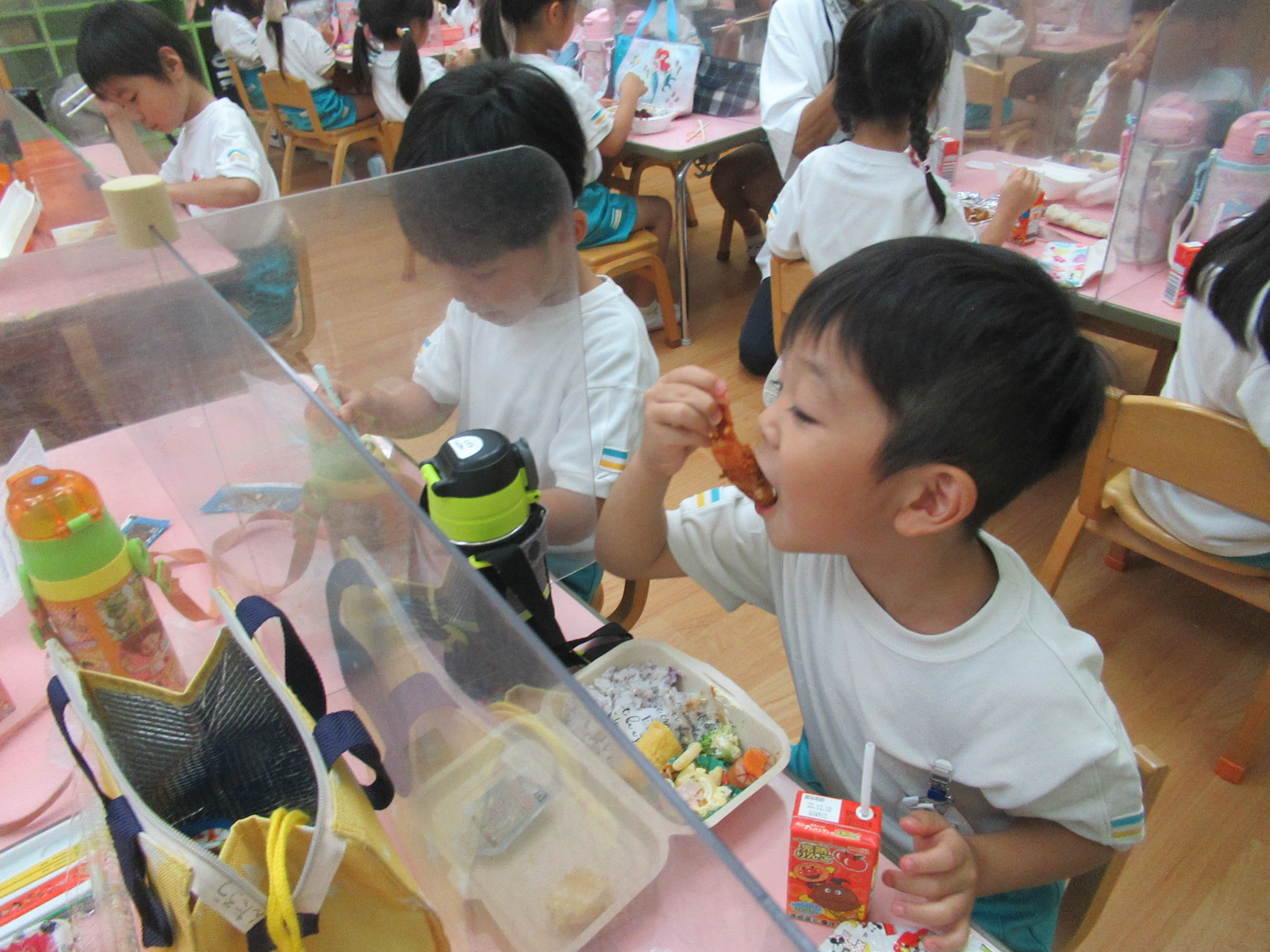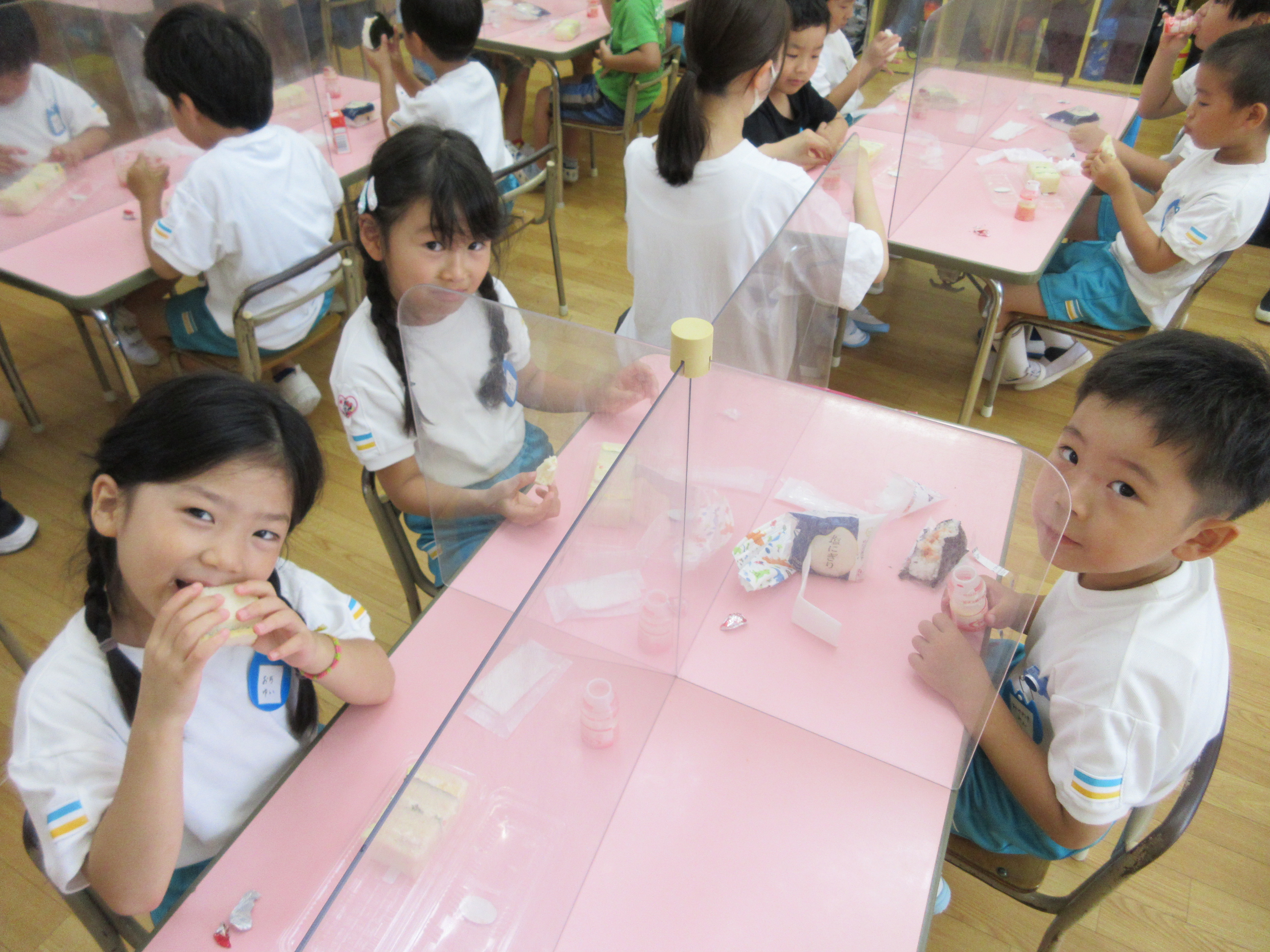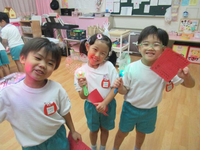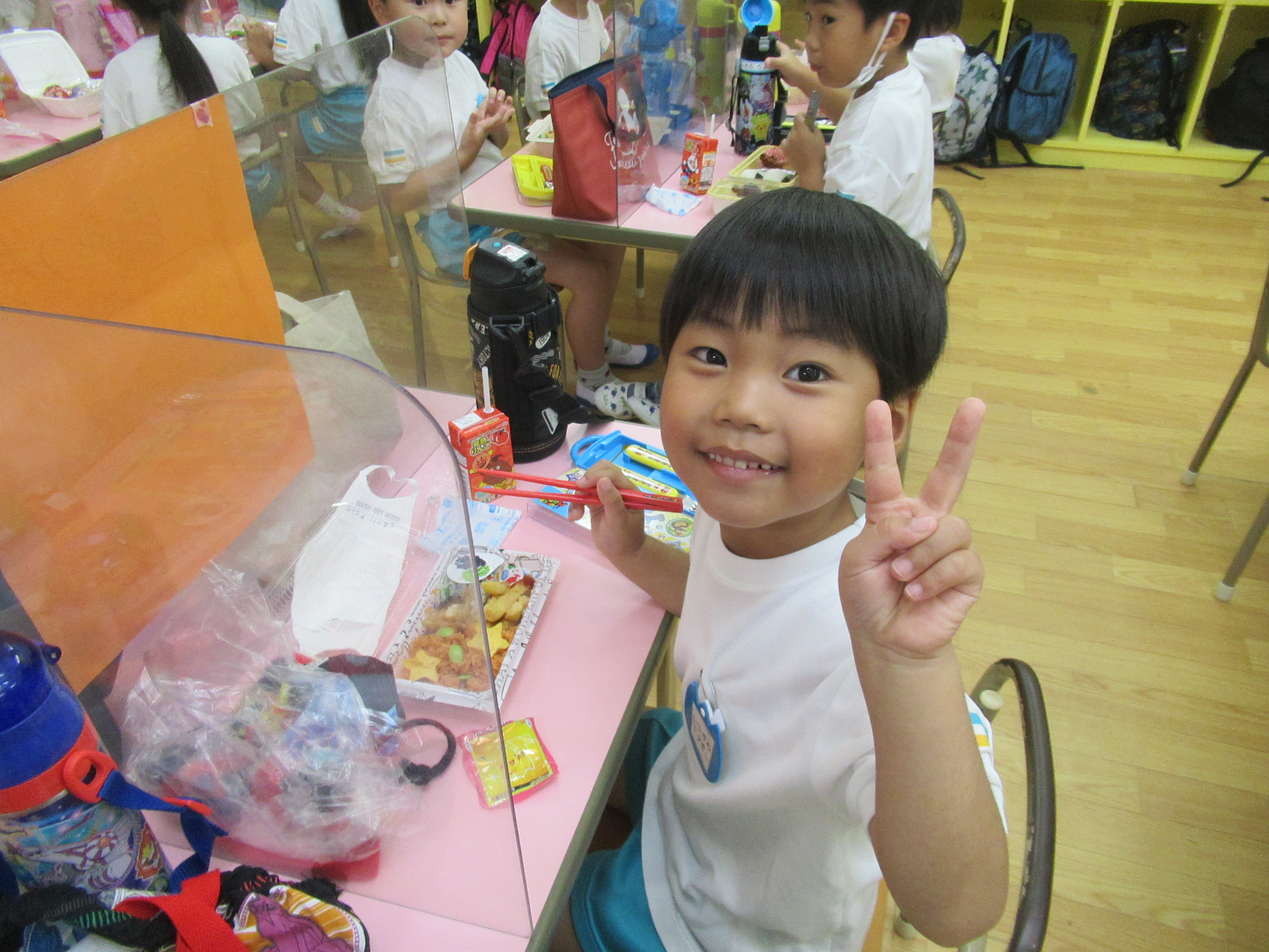幼稚園に泊まって、みんなとご飯を食べて、寝て、遊んで、楽しかった!